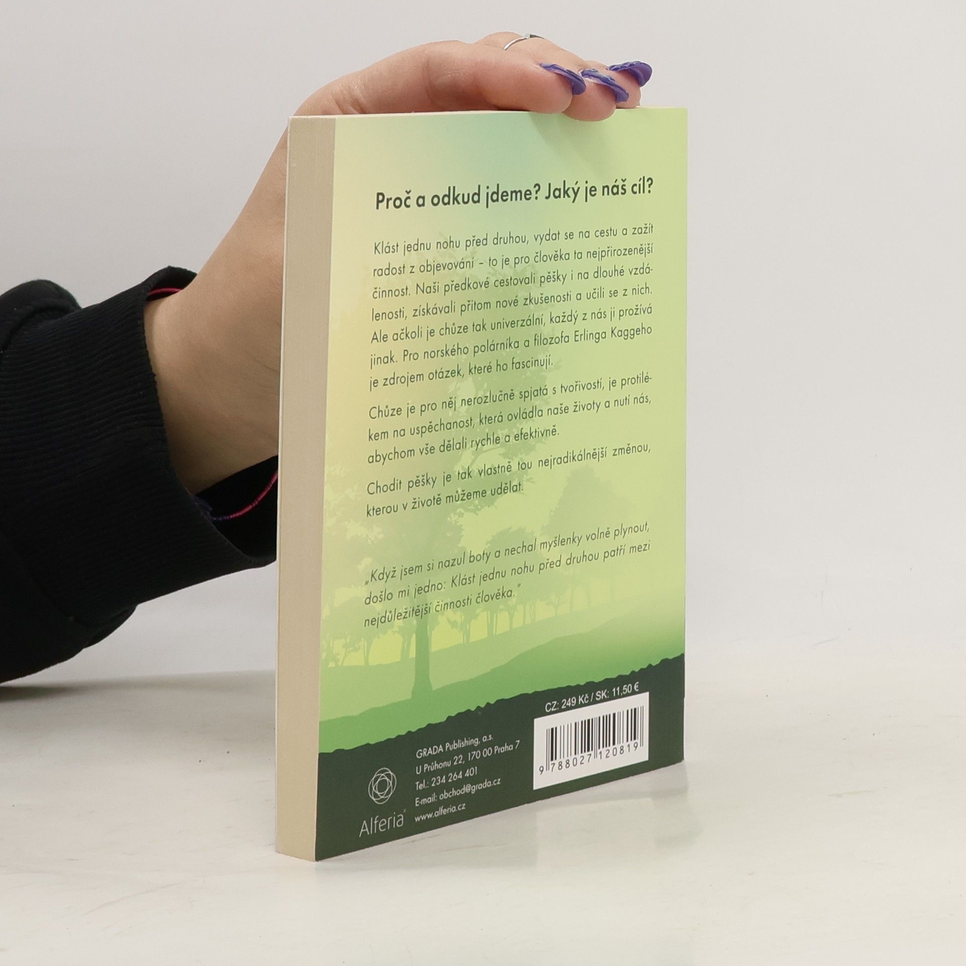 Klást jednu nohu před druhou, vydat se na cestu a zažít radost z objevování – to je pro člověka ta nejpřirozenější činnost. Naši předkové cestovali pěšky i na dlouhé vzdálenosti, získávali přitom nové zkušenosti a učili se z nich. Ale ačkoli je chůze tak univerzální, každý z nás ji prožívá jinak. Pro norského polárníka a filozofa Erlinga Kaggeho je zdrojem otázek, které ho fascinují. Chůze je pro něj nerozlučně spjatá s tvořivostí, je protilékem na uspěchanost, která ovládla naše životy a nutí nás, abychom vše dělali rychle a efektivně. Chodit pěšky je tak vlastně tou nejradikálnější změnou, kterou v životě můžeme udělat. Když jsem si nazul boty a nechal myšlenky volně plynout, došlo mi jedno: Klást jednu nohu před druhou patří mezi nejdůležitější činnosti člověka.