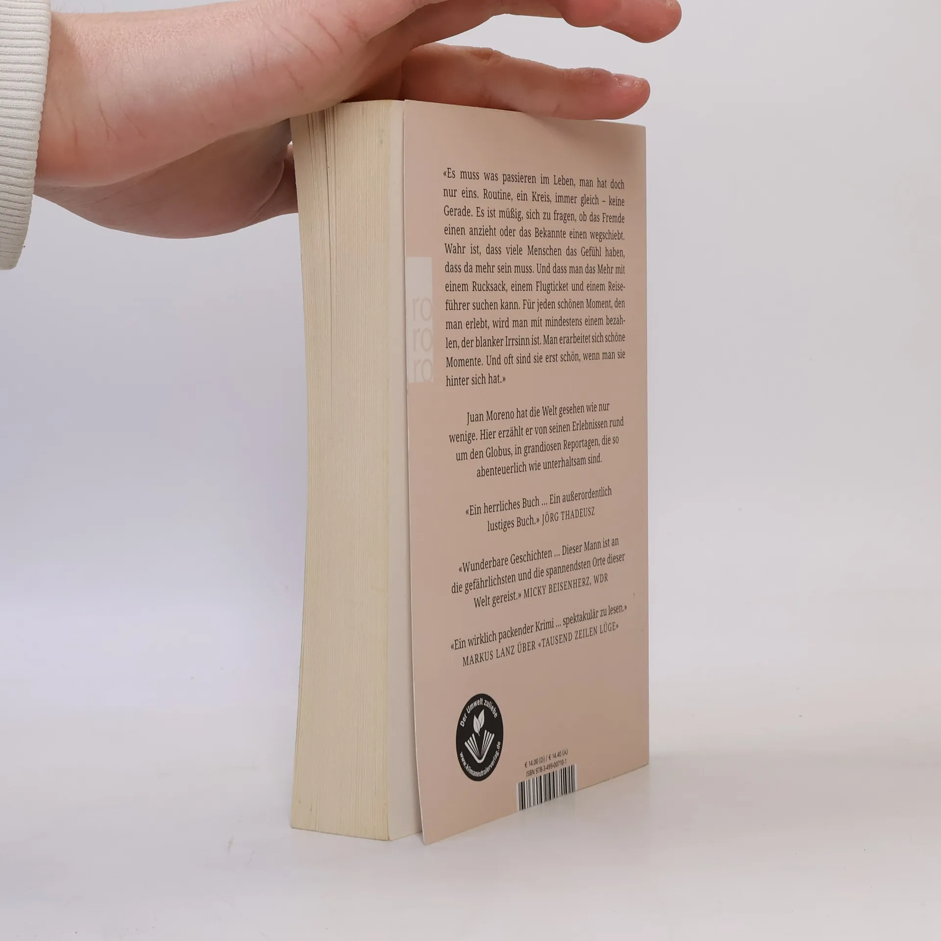 Als der Reporter Juan Moreno von einer seiner Auslandsreisen zurückkommt, sieht er nervös die Drogenspürhunde am Zoll – er ist sich sicher, nach Kokain geradezu zu stinken. Er hat bei kolumbianischen Rebellen im Dschungel auf Kokainplatten geschlafen, anders ging es nicht – aber wie erklärt man das einem deutschen Zollbeamten? Juan Morenos Geschichten von unterwegs sind eine großartige Lektüre, überraschend, dramatisch, packend. Moreno fährt viertausend Kilometer quer durch Europa mit einem Kleinbus voller Arbeitsmigranten, spricht mit Killern der Farc-Guerilla über Auftragsmord und mit Mike Tyson über Schmerz und Ruhm. Mit kubanischen Fischern fährt er aufs Meer, und er überlebt die gefährlichste Flüchtlingsroute der Welt, den Darién Gap. Als er eine Auszeit braucht, geht er ein Jahr lang auf Weltreise. Aber das Abenteuer wartet auf den, der es versteht, auch anderswo: ob zu Hause, bei den frommen Pilgern auf dem Jakobsweg oder in der Heimat Spanien. Dies alles erzählt Moreno in dem typischen Sound, der ihm seit Jahren eine große Leserschaft sichert: mit Witz und Tiefgang, stilistisch elegant und scharf beobachtet.