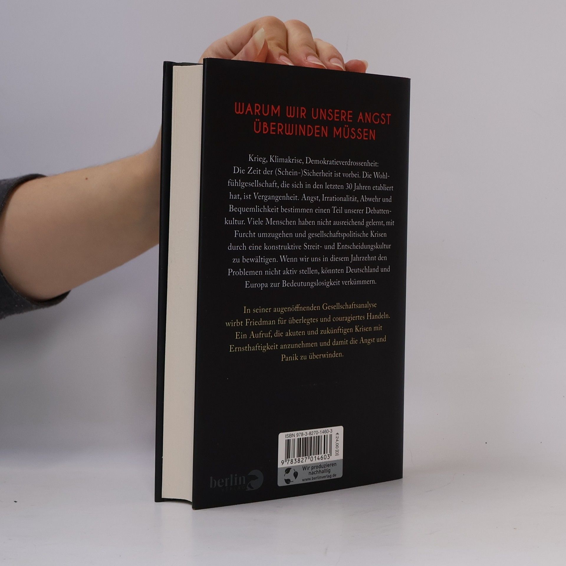 Warum wir unsere Angst überwinden müssen Krieg, Klimakrise, Demokratieverdrossenheit: Die Zeit der Sicherheit ist vorbei, die Wohlfühlgesellschaft, die sich in den letzten 30 Jahren etabliert hat, ist Vergangenheit. Angst, Irrationalität und Abwehr bestimmen einen Teil unserer Debattenkultur. Viele Menschen haben nicht ausreichend gelernt, mit Furcht umzugehen und gesellschaftspolitische Krisen durch eine konstruktive Streitkultur zu bewältigen. Das muss nun nachgeholt werden. Wenn wir uns in diesem Jahrzehnt den Problemen nicht aktiv stellen, könnten Deutschland und Europa zur Bedeutungslosigkeit verkümmern. Ein engagiertes politisches Plädoyer, das Mut macht In seiner augenöffnenden Gesellschaftsanalyse wirbt Friedman für überlegtes und couragiertes Handeln. Ein Aufruf, die akuten und zukünftigen Krisen mit Ernsthaftigkeit anzunehmen und damit die Angst und Panik zu überwinden. »Wir müssen uns unseren Realitäten stellen. Das haben wir seit Jahrzehnten nicht getan. Klimakatastrophe, Seuchengefahr, sozialpolitische und geostrategische Verwerfungen - all das ist uns lange bekannt, doch es war uns lästig. Lieber haben wir die Risse übersehen oder übertüncht. So lange, dass wir heute nicht mehr wissen, was man mit Rissen macht. Wir sind planlos. Nicht krisenfest. Unentschlossen. Das ist gefährlich.« Michel Friedman