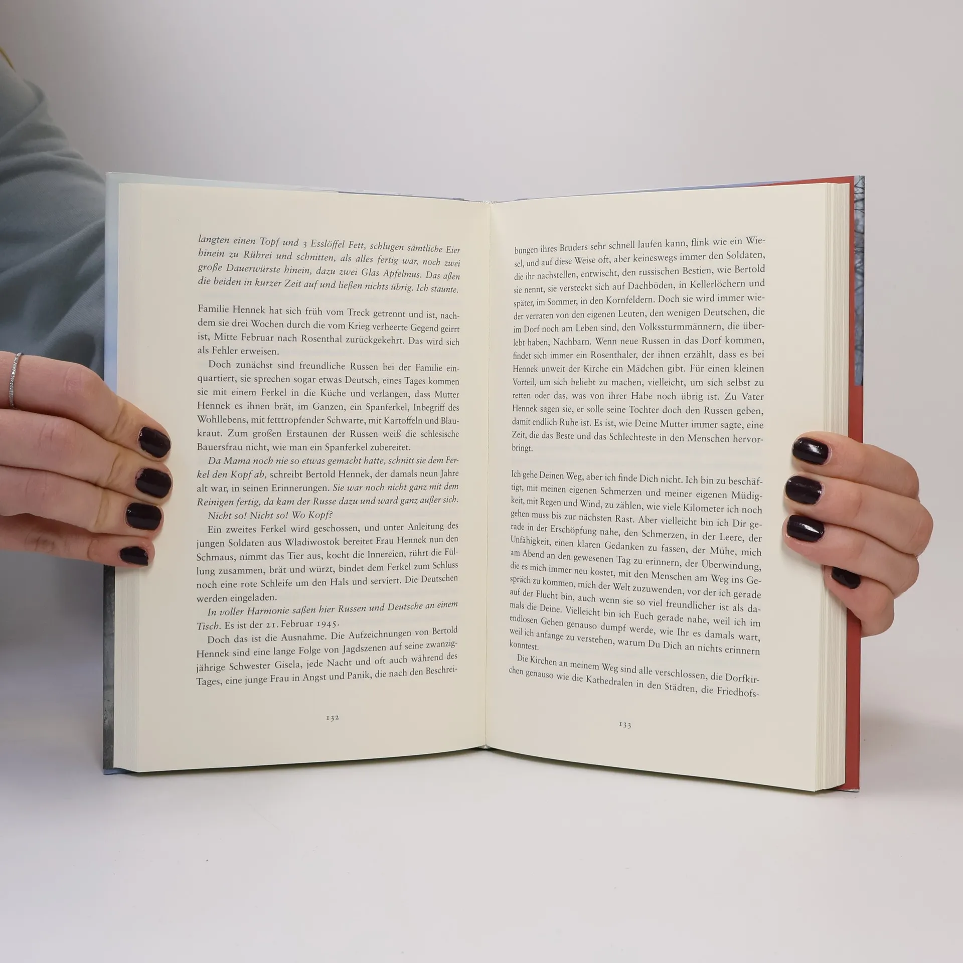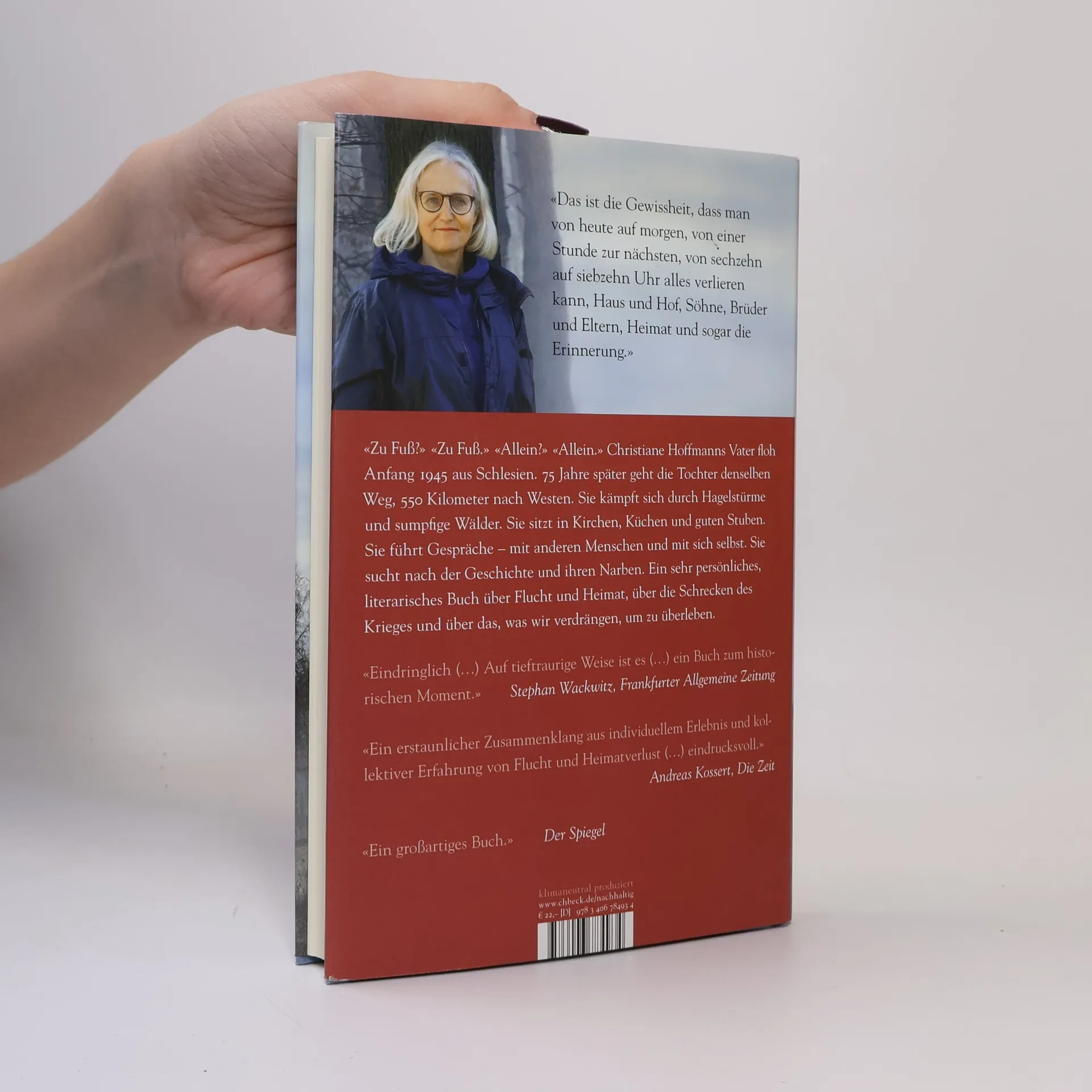 Christiane Hoffmanns Vater floh Anfang 1945 aus Schlesien. 75 Jahre später begibt sich die Tochter auf denselben Weg, 550 Kilometer nach Westen. Auf ihrer Reise kämpft sie sich durch Hagelstürme und sumpfige Wälder, sucht Zuflucht in Kirchen und Küchen und führt Gespräche – sowohl mit anderen als auch mit sich selbst. Dabei erforscht sie die Geschichte ihrer Familie und die Narben, die der Krieg hinterlassen hat. In den 1970er Jahren sitzen die Kinder unter dem Tisch, während die Erwachsenen über ihre verlorene Heimat sprechen und ihre Verletzungen an die nächste Generation weitergeben. Nach dem Tod ihres Vaters kehrt die Tochter in das schlesische Dorf zurück, das jetzt Rózyna heißt. Am 22. Januar 2020 bricht sie auf, um den Weg seiner Flucht noch einmal zu gehen. Was bleibt vom Fluchtschicksal? Wie gehen Familien und Gesellschaften, Deutsche, Polen und Tschechen mit der Vergangenheit um? Hoffmanns Buch bringt die Erinnerung an Flucht und Vertreibung ins 21. Jahrhundert und verknüpft ihre Familiengeschichte mit historischen Erzählungen. Es ist ein sehr persönliches Werk, das die Suche einer Tochter nach ihrem Vater und dessen Geschichte thematisiert. Ein berührendes und emotionales Buch über den Verlust von Heimat und dessen Bedeutung für nachfolgende Generationen.