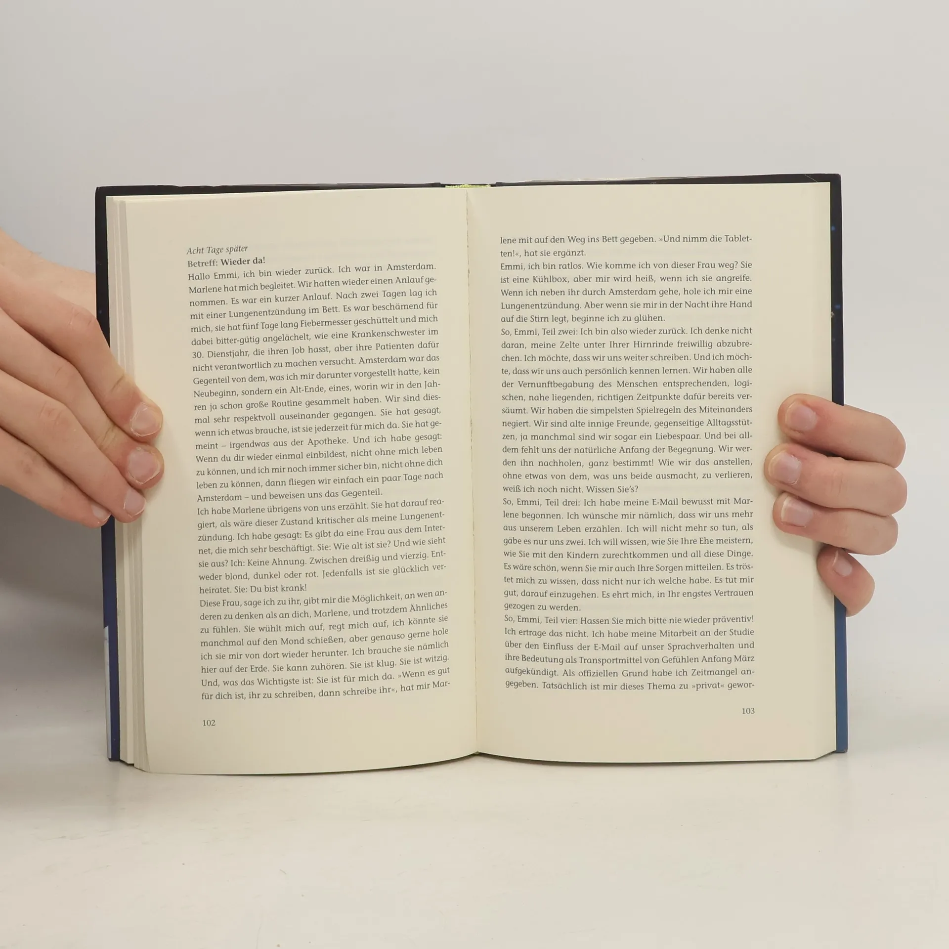 Gibt es in einer vom Alltag besetzten Wirklichkeit einen besser geschützten Raum für gelebte Sehnsüchte als den virtuellen? Bei Leo Leike landen irrtümlich E-Mails einer ihm unbekannten Emmi Rothner. Aus Höflichkeit antwortet er ihr. Und weil sich Emmi von ihm angezogen fühlt, schreibt sie zurück. Bald scheint es nur noch eine Frage der Zeit zu sein, wann es zum ersten persönlichen Treffen kommt, aber diese Frage wühlt beide so sehr auf, dass sie die Antwort lieber noch eine Weile hinauszögern. Außerdem ist Emmi glücklich verheiratet. Und Leo verdaut gerade eine gescheiterte Beziehung. Und überhaupt: Werden die gesendeten, empfangenen und gespeicherten Liebesgefühle einer Begegnung standhalten? Und was, wenn ja?
