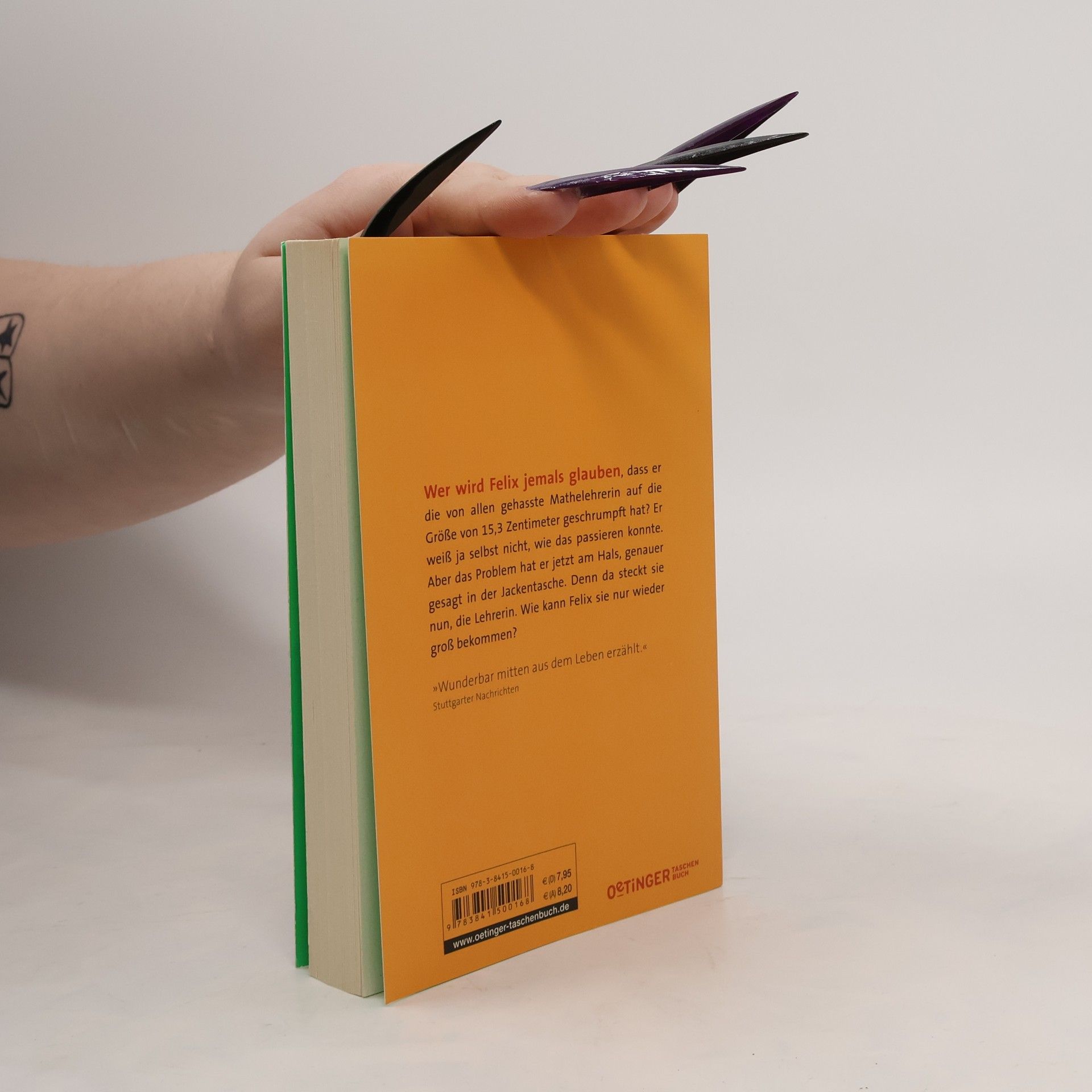Die Lehrerin in die Tasche stecken! Wer wird dem 12jährigen Felix jemals glauben, dass er die von allen gehasste Mathelehrerin auf die Größe von 15,3 Zentimeter geschrumpft hat? Er weiß ja selbst nicht, wie es passiert ist! Aber das Problem hat er nun am Hals, genauer gesagt in der Jackentasche. Denn da steckt sie nun, die Mathelehrerin und ist noch immer am Schimpfen. Wie kann Felix sie nur wieder groß bekommen? Auf der Suche nach der Ursache der Verwandlung wird Felix immer mutiger und lässt sich zunehmend weniger herumkommandieren - vor allem aber stößt er auf eine unglaubliche Geschichte, die vor 100 Jahren geschehen sein soll. Spannend und voller Situationskomik - und Schülern aus der Seele gesprochen!