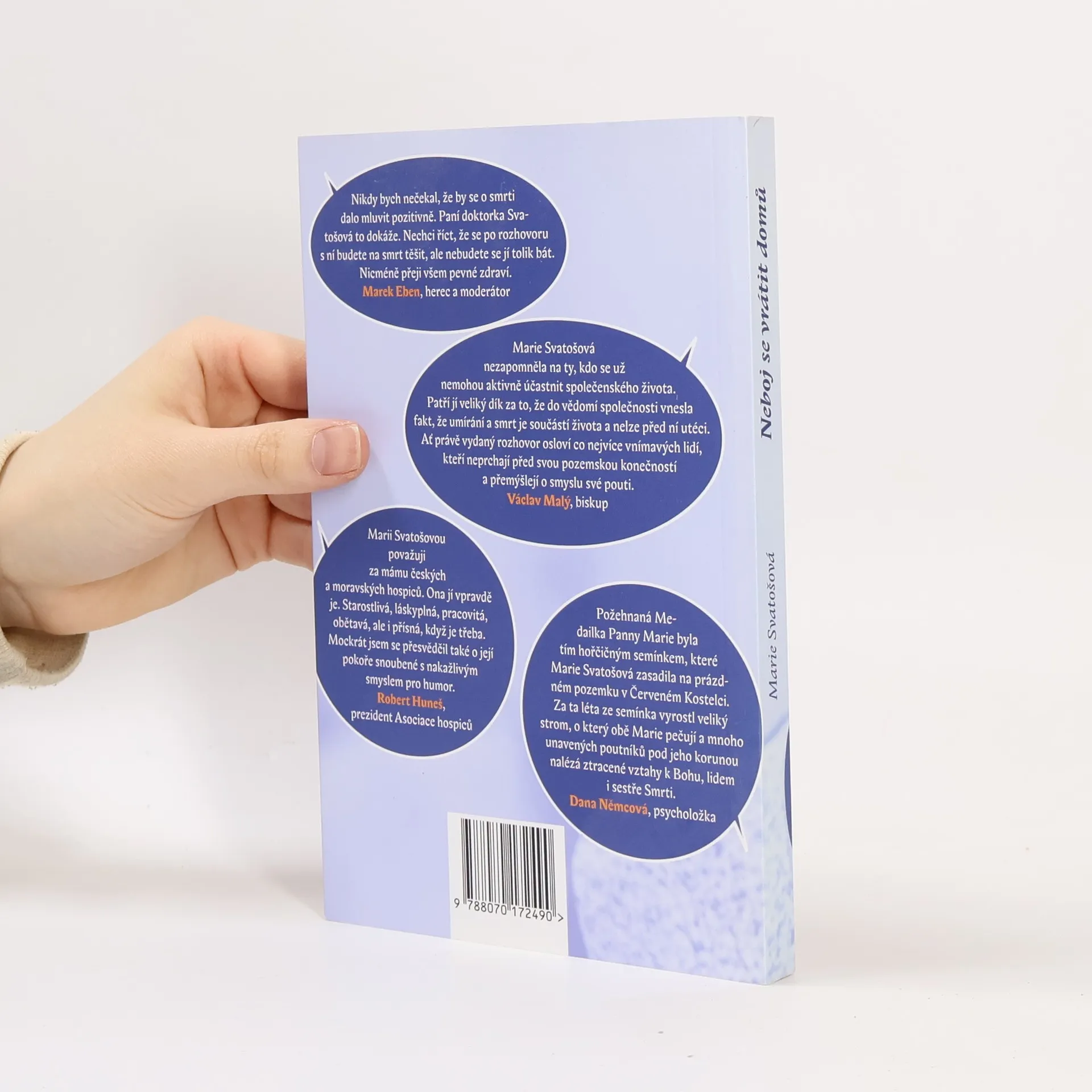 Marie Svatošová v rozhovoru s Alešem Palánem. Co se stane, pokud pacientovi o jeho zdravotním stavu dlouhodobě lžeme? Má vážná choroba nějaký smysl? A proč umírající nezabíjet, jak si přejí zastánci eutanázie, ale naopak respektovat jejich život až do přirozeného konce a být jim nablízku? Nejen o těchto věcech hovoří v knize rozhovorů Neboj se vrátit domů zakladatelka hospicového hnutí v ČR Marie Svatošová. Rozhovor s ní vede spisovatel a novinář Aleš Palán. Právě Svatošová před lety přišla s myšlenkami hospicové paliativní péče. Byla to ona, kdo v Červeném Kostelci iniciovala první český hospic. A je to stále ona, kdo neúnavně jezdí po republice s hospicovými přednáškami a je rádkyní hospicům nově vznikajícím. Marie Svatošová v knize mluví také o své rodině, studiu medicíny, vlivu, jaký na ni měl P. Ladislav Kubíček či o svém trapistickém fan clubu. V mnoha hospicích najdeme citát: „Našim cílem je naplnit dny životem, nikoliv život dny.“ Autorka tohoto výroku Marie Svatošová dokázala životem naplnit celý svůj život. A nejen životem, také smyslem a neokázalou službou. „Nikdy bych nečekal, že by se o smrti dalo mluvit pozitivně. Paní doktorka Svatošová to dokáže. Nechci říct, že se po rozhovoru s ní budete na smrt těšit, ale nebudete se jí tolik bát,“ říká k obsahu knihy herec a moderátor Marek Eben. „Nicméně přeji všem pevné zdraví,“ dodává.