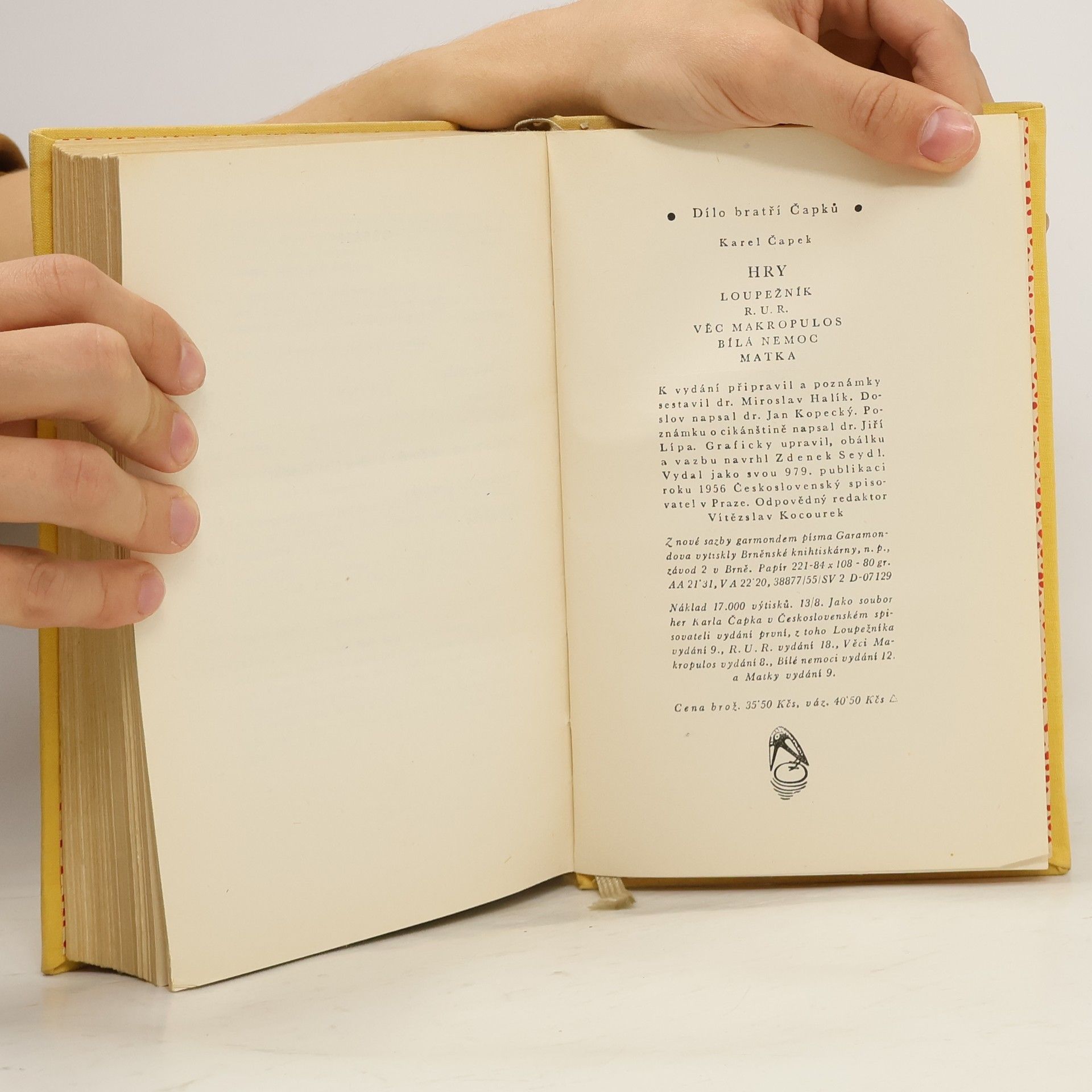 První vydání souboru her od Karla Čapka, který obsahuje hry: Loupežník, R. U. R., Věc Makropulos, Bílá nemoc a Matka.