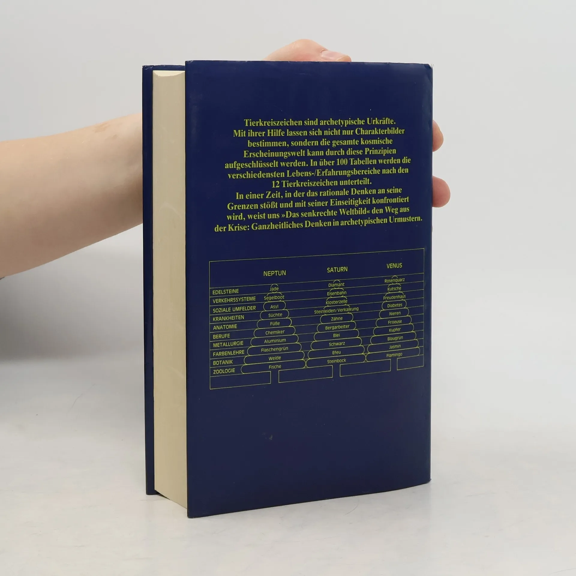 Die 12 Tierkreiszeichen sind Ursymbole, archetypische Kräfte, denen sich nicht nur der Mensch, sondern die gesamte Welt zuordnen läßt. In über 100 Tabellen werdn alle Lebensbereiche, wie die Tierwelt, Landschaften, Baustile etc., mit den einzelnen Tierkreiszeichen verknüpft. Neben dem hohen Unterhaltungswert bieten die Tabellen für Lernaufgaben, sprich Planetenprinzipien, verschiedene Lösungsebenen an. So kann dieses Buch helfen, die Sprache des Schicksals zu entschlüsseln und Schicksalsschläge bewußt als Lernaufgaben zu erfahren. In einer Zeit, in der das rationale Denken an seine Grenzen stößt und wir mit seiner Einseitigkeit konfrontiert werden, weist das senkrechte Weltbild den Weg aus der Krise: Ganzheitliches Denken in archetypischen Urmustern.