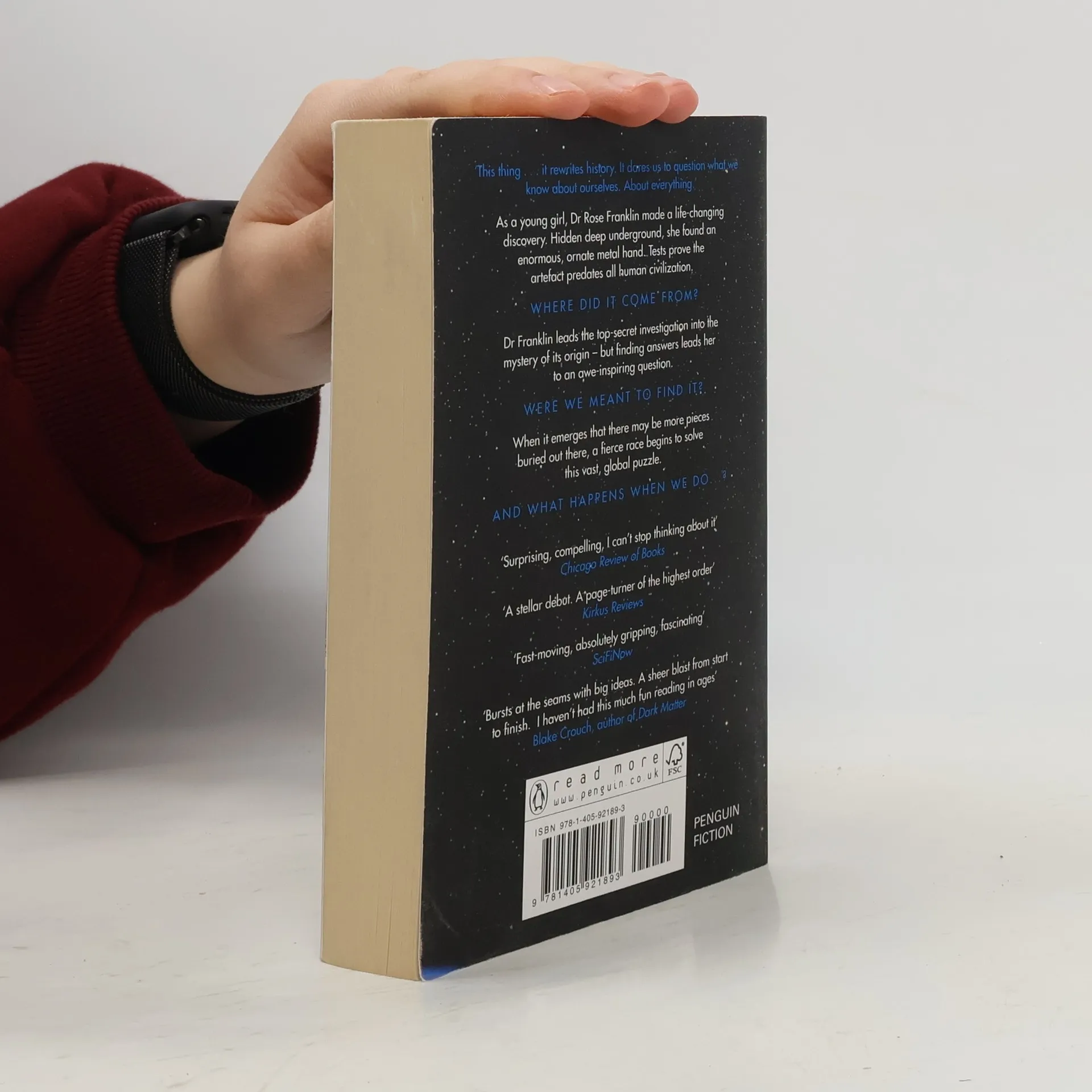 A girl named Rose is riding her new bike near home in Deadwood, South Dakota, when she falls through the earth. She wakes up at the bottom of a square-shaped hole, its walls glowing with intricate carvings. But the firemen who come to save her peer down upon something even stranger: a little girl in the palm of a giant metal hand. Seventeen years later, the mystery of the bizarre artifact remains unsolved - the object's origins, architects, and purpose unknown. But some can never stop searching for answers. Rose Franklin is now a highly trained physicist leading a top-secret team to crack the hand's code. And along with her colleagues, she is being interviewed by a nameless interrogator whose power and purview are as enigmatic as the relic they seek. What's clear is that Rose and her compatriots are on the edge of unravelling history's most perplexing discovery-and finally figuring out what it portends for humanity. But once the pieces of the puzzle are in place, will the result be an instrument of lasting peace or a weapon of mass destruction?