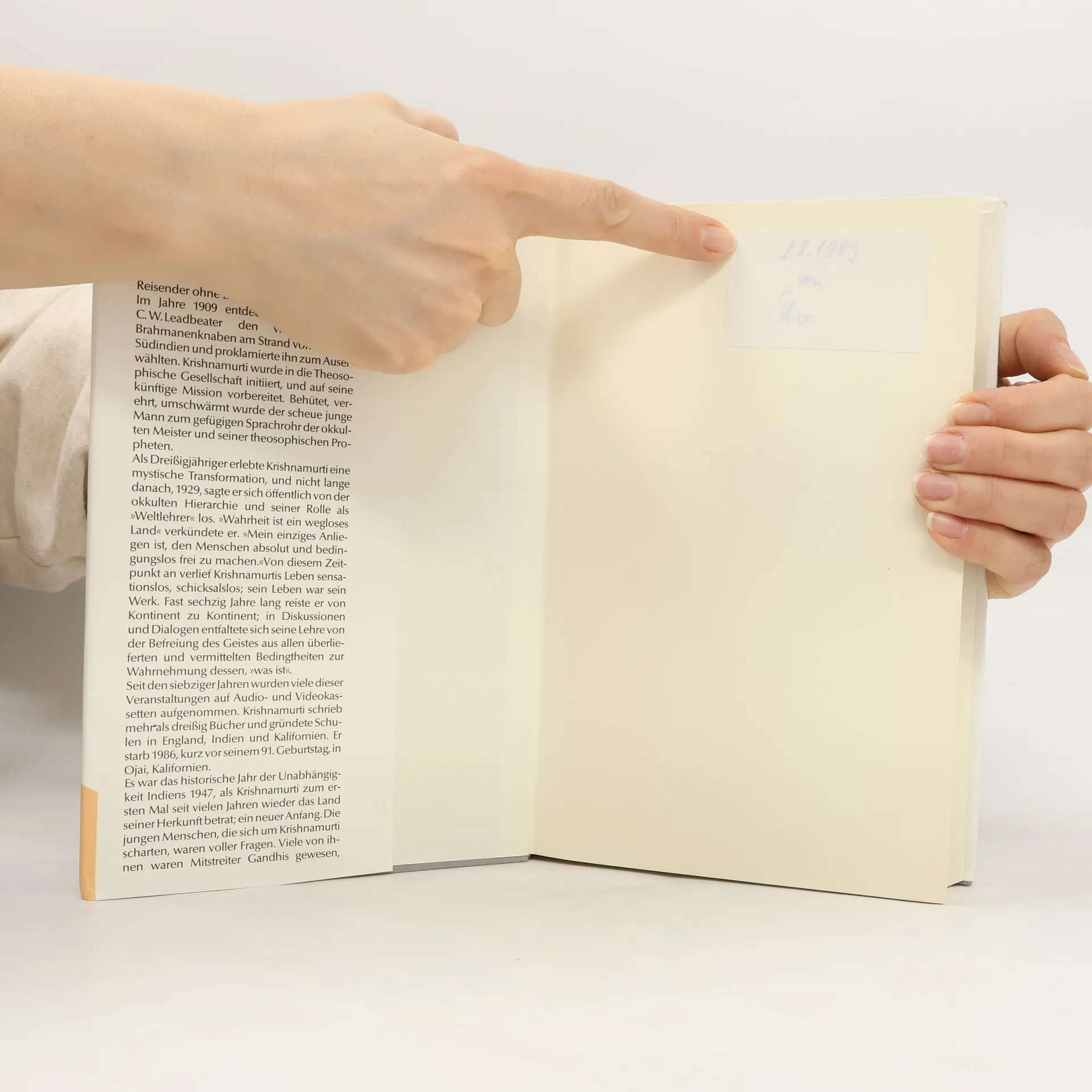 1909, als er gerade vierzehn war, wurde Krishnamurti als zukünftiger Weltlehrer proklamiert, in dem sich Maitreya, der Bodhisattva des Mitgefühls, manifestieren würde. Verkündigt wurde dies von Annie Besant, der damaligen Präsidentin der Theosophischen Gesellschaft, die es als ihre Aufgabe sieht, die grundlegenden Gemeinsamkeiten der Weltreligionen herauszuarbeiten. Annie Besant bereitete Krishnamurti auf seine Rolle als Auserwählter vor. Zwanzig Jahre später vollzog sich jedoch in Krishnamurti eine tiefgreifende Wandlung. Darauf hin trat er als eigenständiger Lehrer in Erscheinung, den man an der Originalität seiner Präsentation der Wahrheit als wahren spirituellen Lehrer erkannte. Krishnamurti durchlief schwere körperliche und emotionale Prüfungen, bevor er den Gipfel der Freiheit erreichte. Fortan lehrte er in aller Welt und zog mitunter große Menschenmassen an. Staatsmänner (z. B. Nehru und Indira Gandhi) suchten seinen Rat und Wissenschaftler und Künstler ließen sich von ihm inspirieren. Krishnamurti verstarb 1986 im Alter von fast 91 Jahren.