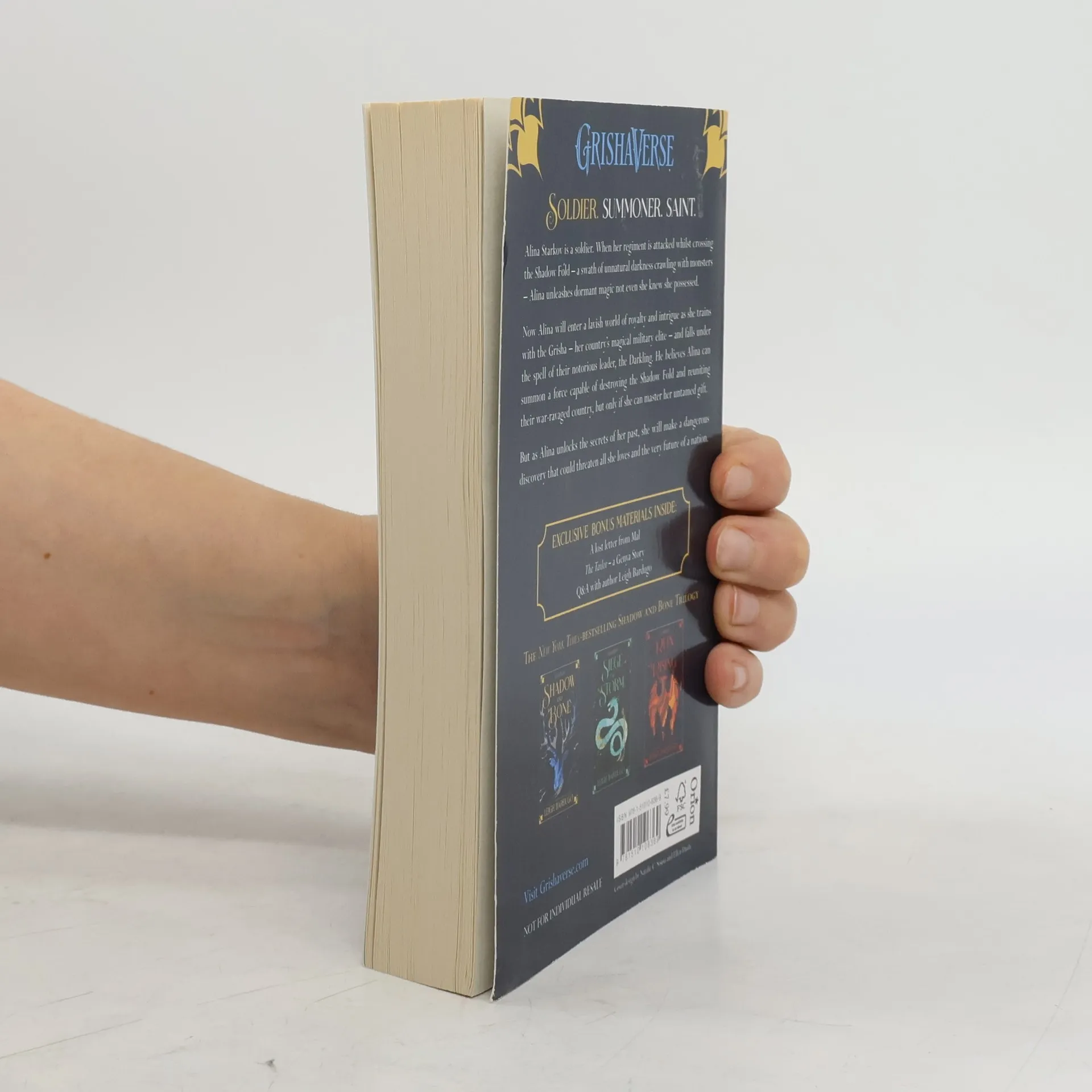 Surrounded by enemies, the once-great nation of Ravka has been torn in two by the Shadow Fold, a swath of near impenetrable darkness crawling with monsters who feast on human flesh. Now its fate may rest on the shoulders of one lonely refugee. Alina Starkov has never been good at anything. But when her regiment is attacked on the Fold and her best friend is brutally injured, Alina reveals a dormant power that saves his life—a power that could be the key to setting her war-ravaged country free. Wrenched from everything she knows, Alina is whisked away to the royal court to be trained as a member of the Grisha, the magical elite led by the mysterious Darkling. Yet nothing in this lavish world is what it seems. With darkness looming and an entire kingdom depending on her untamed power, Alina will have to confront the secrets of the Grisha . . . and the secrets of her heart. Shadow and Bone is the first installment in Leigh Bardugo's Grisha Trilogy.