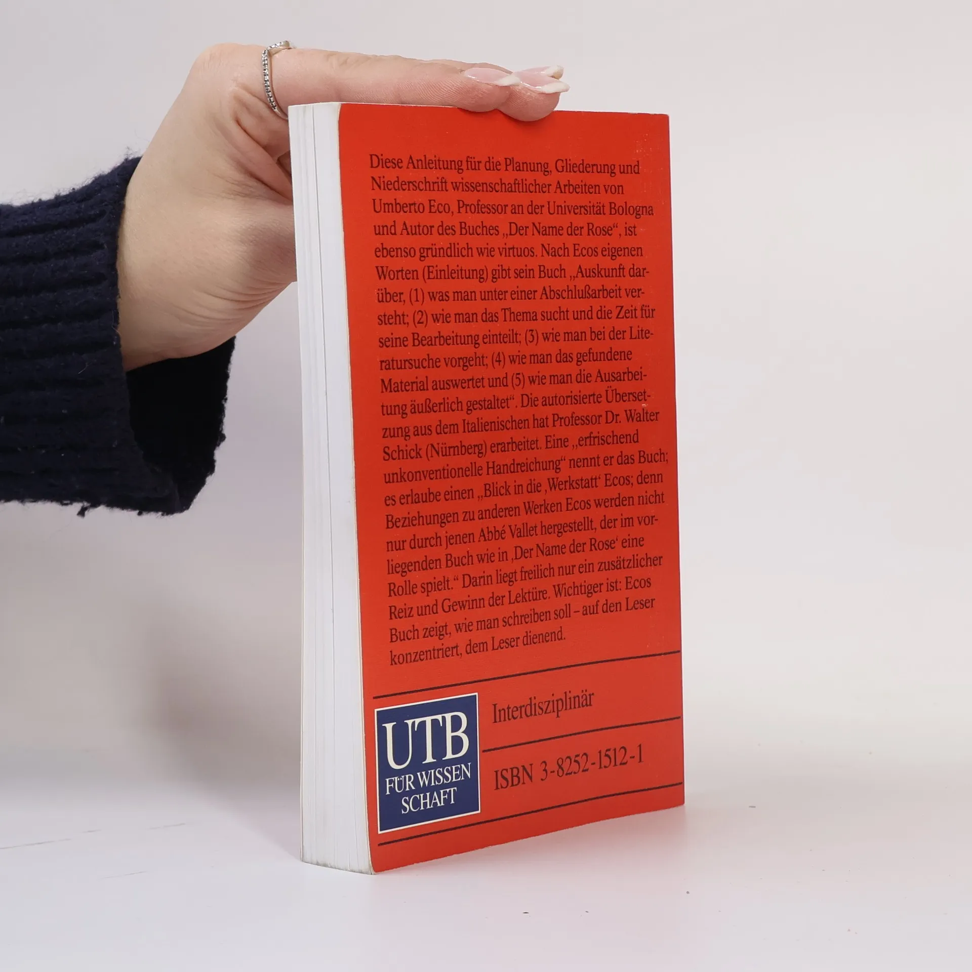 Diese Anleitung für die Planung, Gliederung und Niederschrift wissenschaftlicher Arbeiten von Umberto Eco, Professor an der Universität Bologna, ist ebenso gründlich wie virtuos. Nach Ecos eigenen Worten (Einleitung) gibt sein Buch „Auskunft darüber, (1) was man unter einer Abschlussarbeit versteht, (2) wie man das Thema sucht und die Zeit für seine Bearbeitung einteilt, (3) wie man bei der Literatursuche vorgeht, (4) wie man das gefundene Material auswertet und (5) wie man die Ausarbeitung äußerlich gestaltet“. Die autorisierte Übersetzung hat Professor Dr. Walter Schick erarbeitet. Eine „erfrischend unkonventionelle Handreichung“ nennt er das Buch; es erlaube einen "Blick in die 'Werkstatt' Ecos; denn Beziehungen zu anderen Werken Ecos werden nicht nur durch jenen Abbé Vallet hergestellt, der im vorliegenden Buch wie in 'Der Name der Rose' eine Rolle spielt." Darin liegt freilich nur ein zusätzlicher Reiz und Gewinn der Lektüre. Wichtiger ist: Ecos Buch zeigt, wie man schreiben soll - auf den Leser konzentriert, dem Leser dienend.