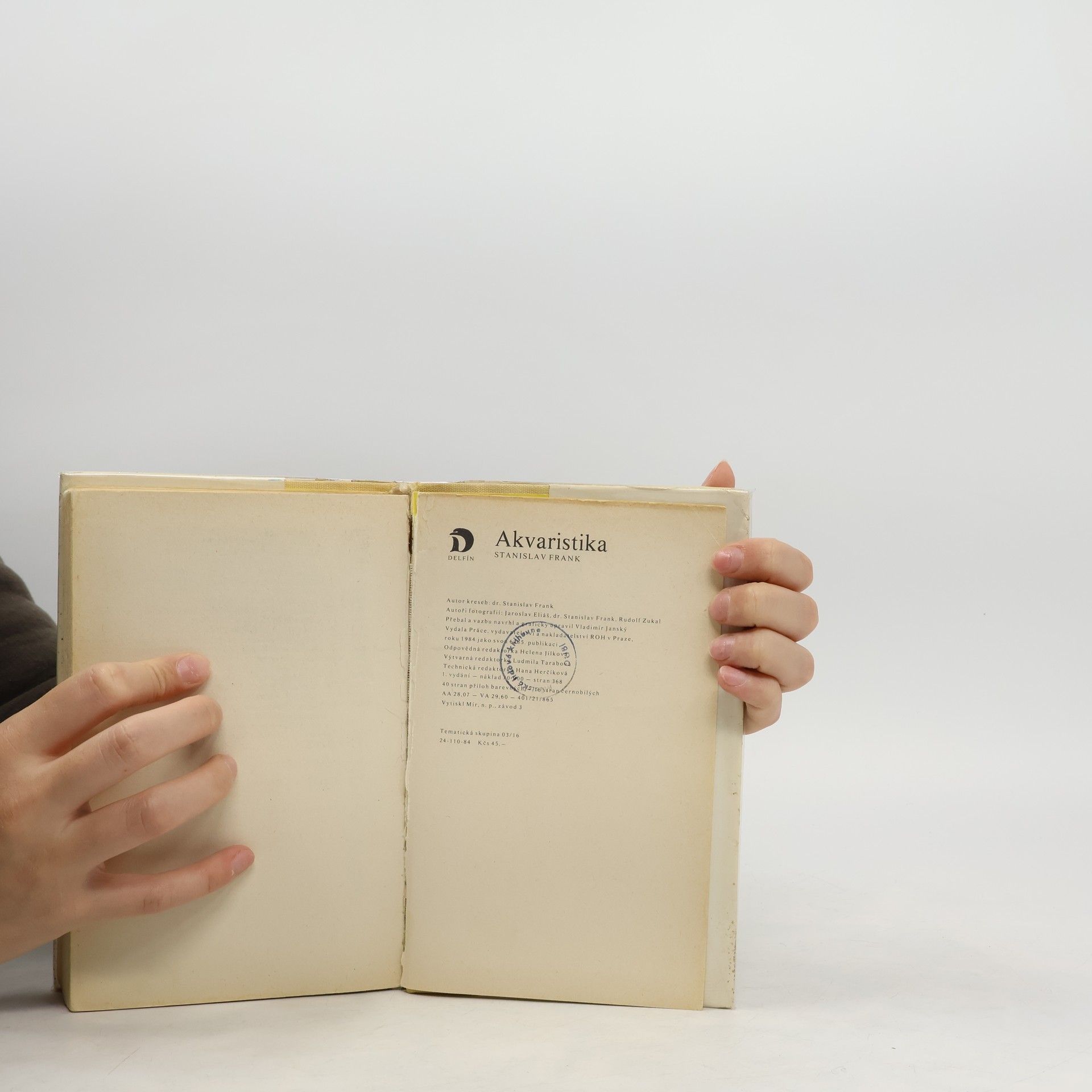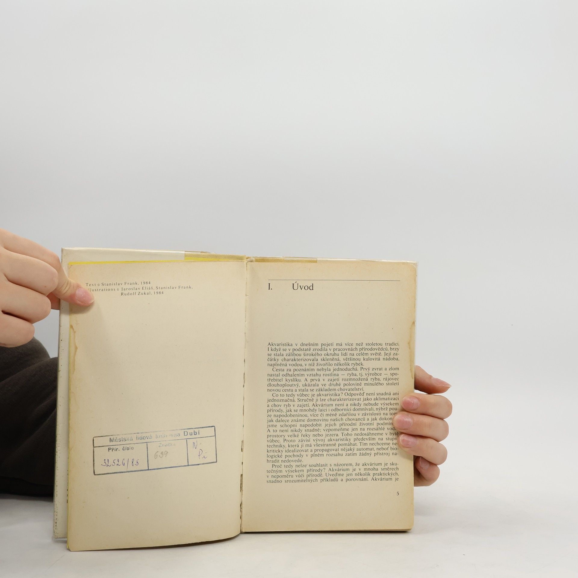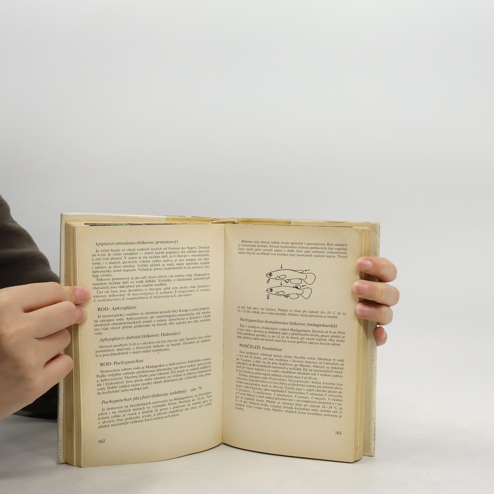 Rady pro chvatele rybek v akváriu. Kapitoly: Původ akvarijních ryb. Fyzikálně chemické a biologické faktory podmiňující a ovlivňující život ryb v přírode i v zajetí, Světlo, Teplota, Proudění, Vodivost, Celková tvrdost vody, Alkalita /uhličitanová či přechodná tvrdost vody/, Stálá či síranová tvrdost vody, Chloridy, Tvrdá a měkká voda, Hodnota pH, Kyslík, Oxid /kysličník/ uhličitý, Redukčně oxidační potenciál, Dusíkaté látky, Barva vody, Potrava či výživa a krmení ryb v zajetí, Aklimatizace ryb v akváriu, Pohlavní dvojtvárnost čili dimorfismus, Rozmnožování ryb, Vývoj jiker a rybích zárodků, Odchov plůdku a mladých rybek. Čeledi a podčeledi ryb. Rostliny. Nemoci, škůdci a otravy ryb-Viry, Baktérie, Plísně, Léčiva a jejich použití. První vydání. Cena knihy v čase vydání: 45.- Kčs.