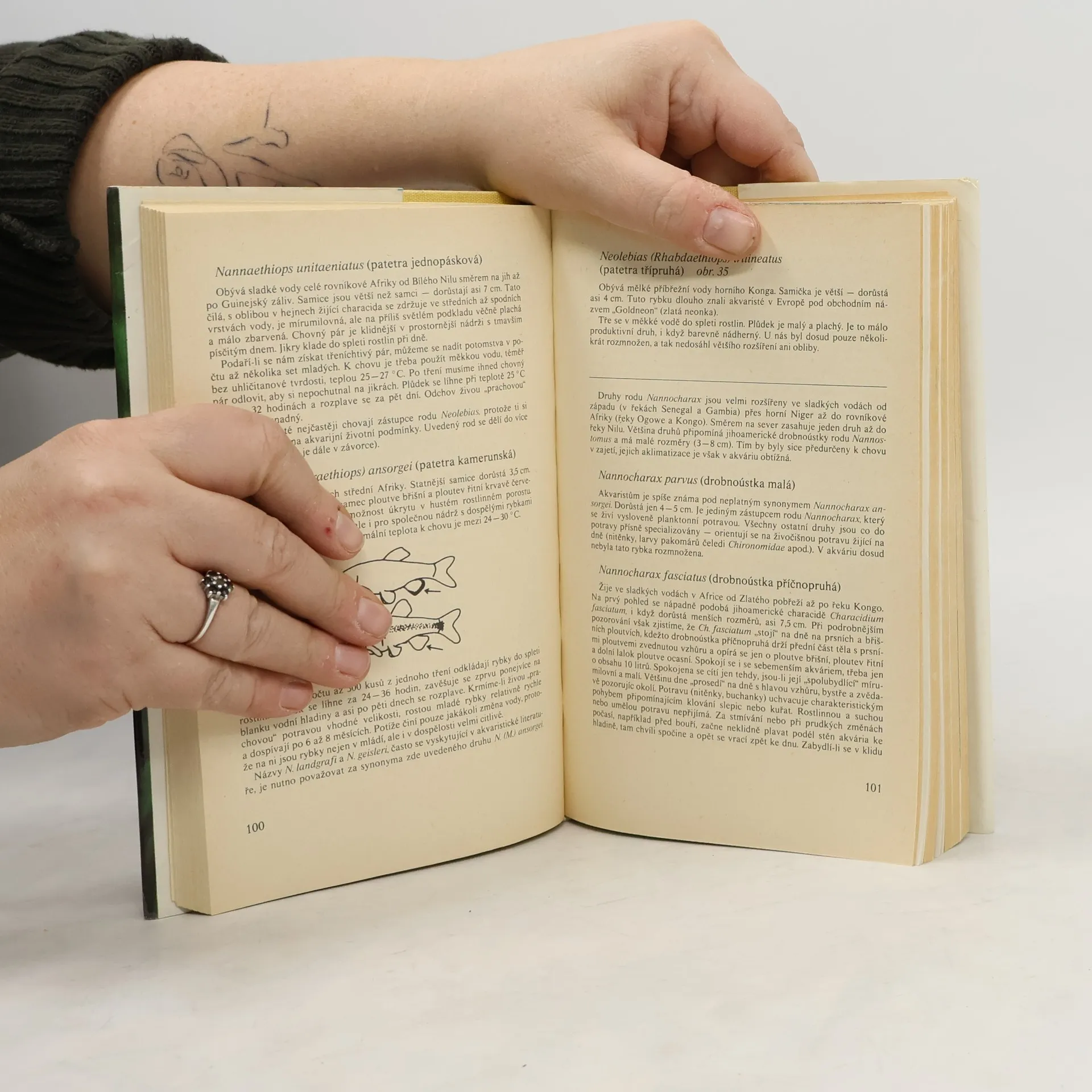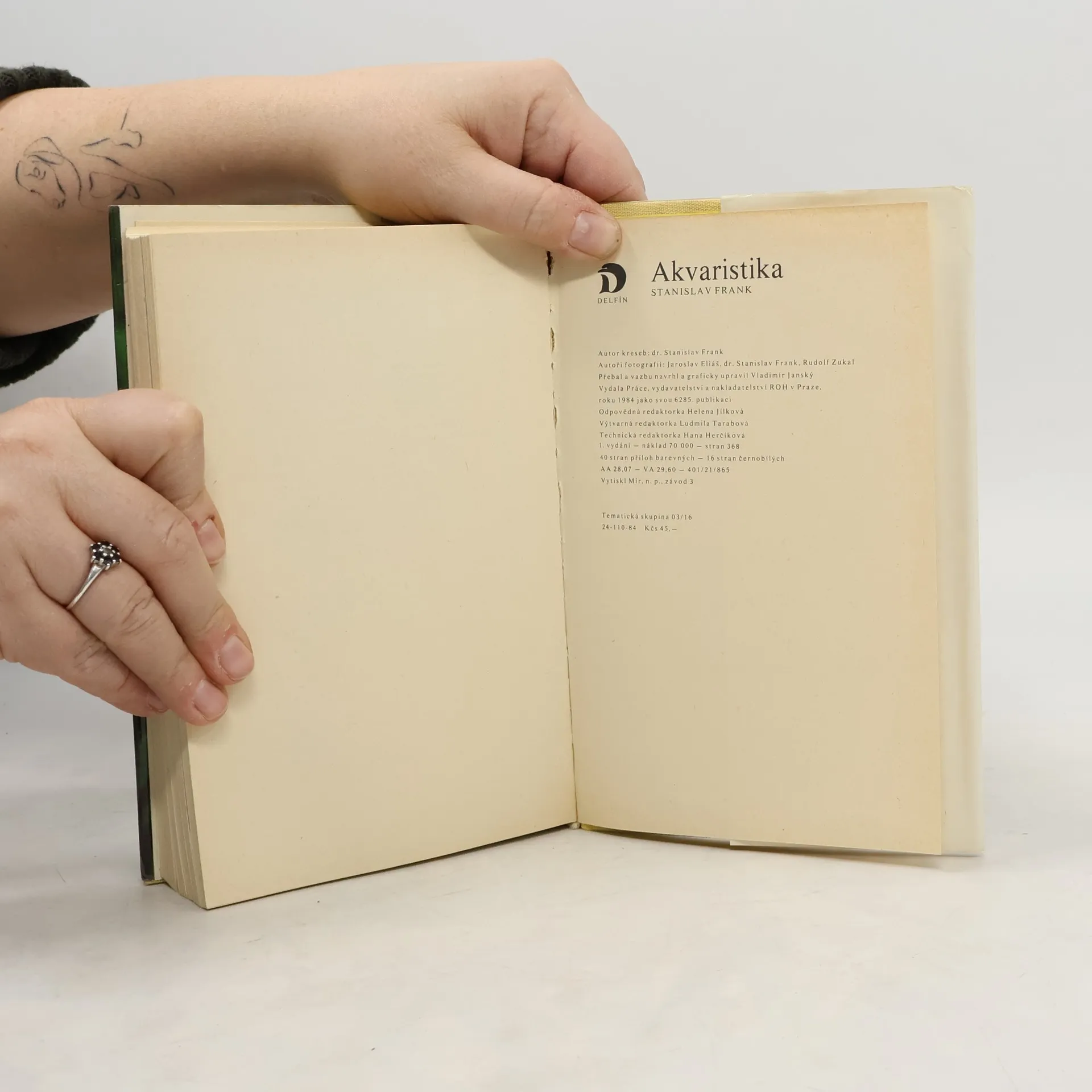 Rady pro chvatele rybek v akváriu. Kapitoly: Původ akvarijních ryb. Fyzikálně chemické a biologické faktory podmiňující a ovlivňující život ryb v přírode i v zajetí, Světlo, Teplota, Proudění, Vodivost, Celková tvrdost vody, Alkalita /uhličitanová či přechodná tvrdost vody/, Stálá či síranová tvrdost vody, Chloridy, Tvrdá a měkká voda, Hodnota pH, Kyslík, Oxid /kysličník/ uhličitý, Redukčně oxidační potenciál, Dusíkaté látky, Barva vody, Potrava či výživa a krmení ryb v zajetí, Aklimatizace ryb v akváriu, Pohlavní dvojtvárnost čili dimorfismus, Rozmnožování ryb, Vývoj jiker a rybích zárodků, Odchov plůdku a mladých rybek. Čeledi a podčeledi ryb. Rostliny. Nemoci, škůdci a otravy ryb-Viry, Baktérie, Plísně, Léčiva a jejich použití. První vydání. Cena knihy v čase vydání: 45.- Kčs.