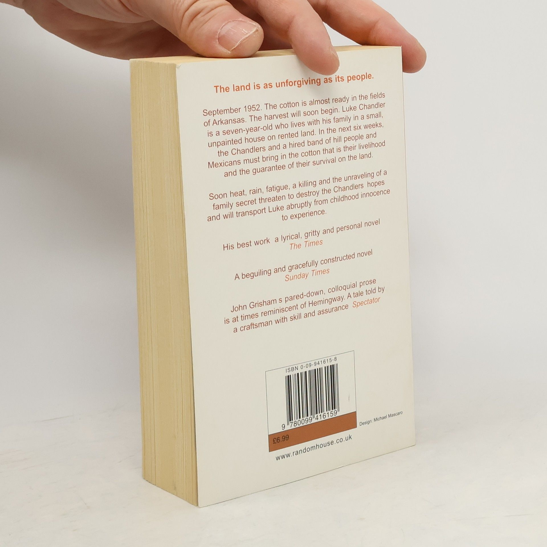 The hill people and the Mexicans arrived on the same day. It was a Wednesday, early in September 1952. The Cardinals were five games behind the Dodgers with two weeks to go, and the season looked hopeless. The cotton, however, was waist high to my father, almost over my head, and he and my grandfather could be heard before supper whispering words that were seldom heard. It could be a "good crop." Thus begins the new novel from John Grisham, a story inspired by his own childhood in rural Arkansas. The narrator is a seven year old farm boy named Luke Chandler, who lives in the cotton fields with his parents and grandparents in a little house that's never been painted. The Chandlers farm eighty acres that they rent, not own, and when the cotton is ready they hire a truckload of Mexicans and a family from the Ozarks to help harvest it. For six weeks they pick cotton, battling the heat, the rain, the fatigue, and sometimes, each other. As the weeks pass Luke sees and hears things no seven year old could possibly be prepared for, and finds himself keeping secrets that not only threaten the crop but will change the lives of the Chandlers forever. A Painted House is a moving story of one boy's journey from innocence to experience.