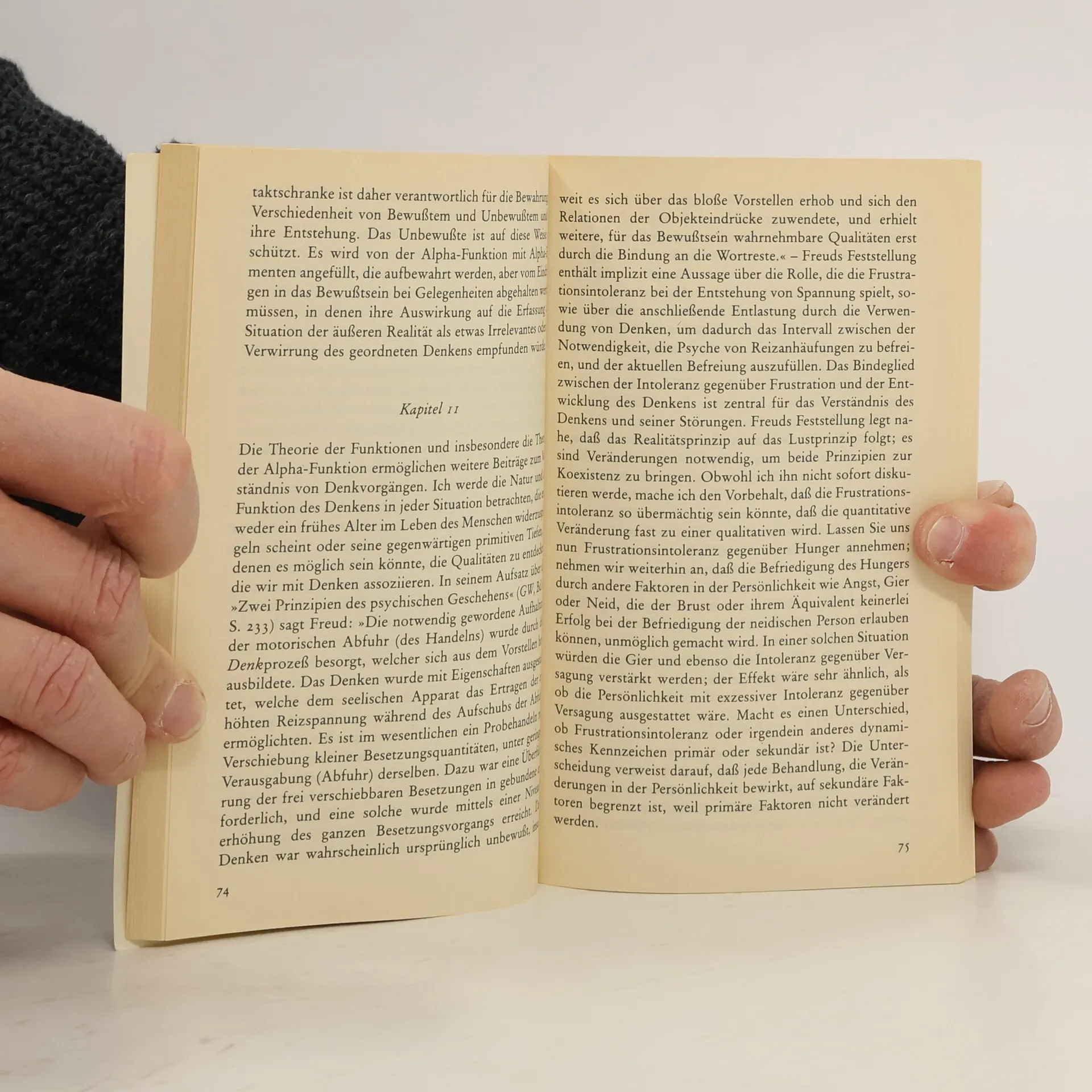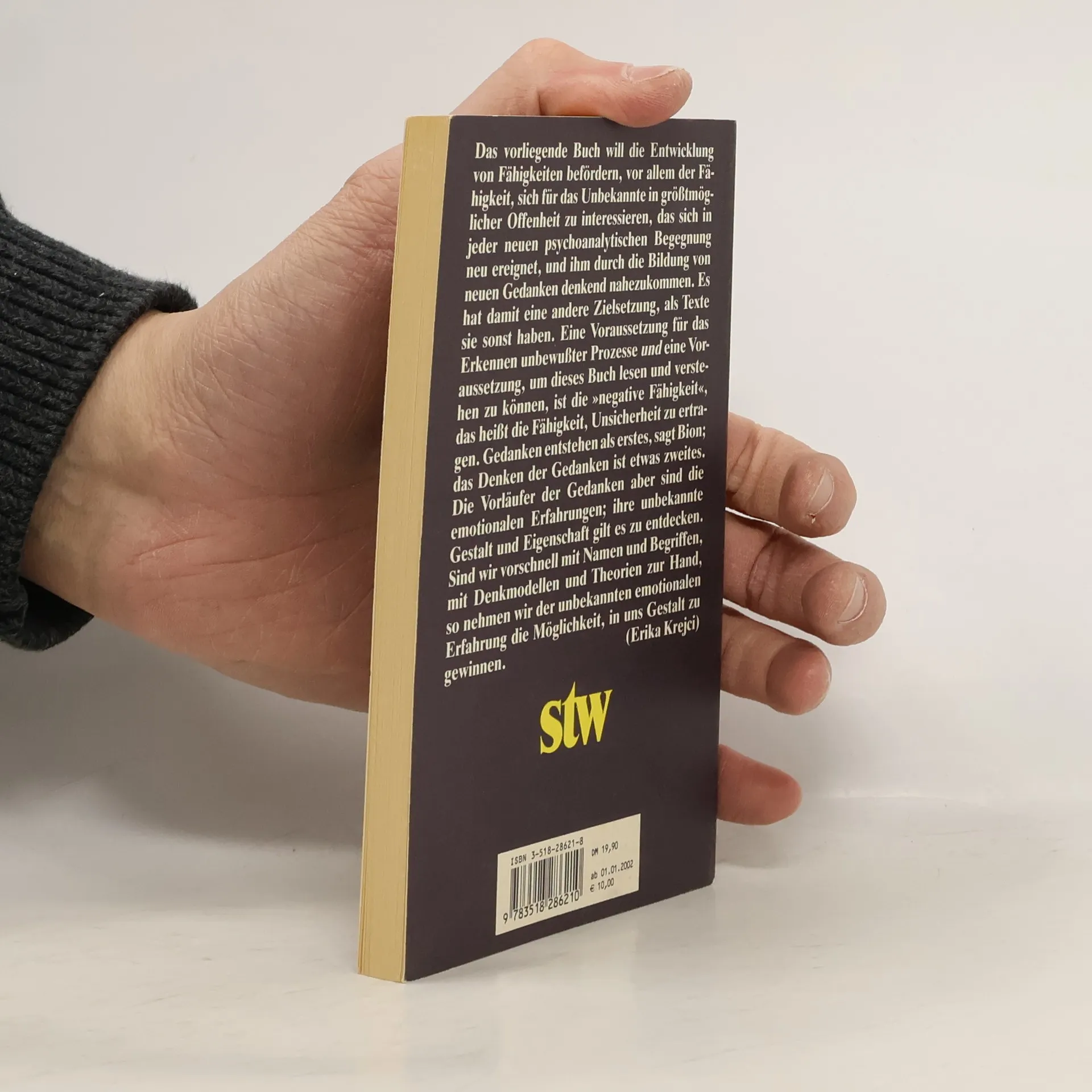 „Das vorliegende Buch will die Entwicklung von Fähigkeiten befördern, vor allem der Fähigkeit, sich für das Unbekannte in größtmöglicher Offenheit zu interessieren, das sich in jeder neuen psychoanalytischen Begegnung neu ereignet, und ihm durch die Bildung von neuen Gedanken denkend nahezukommen. Eine Voraussetzung für das Erkennen unbewußter Prozesse und eine Voraussetzung, um dieses Buch lesen und verstehen zu können, ist die »negative Fähigkeit«, das heißt die Fähigkeit, Unsicherheit zu ertragen. Gedanken entstehen als erstes, sagt Bion; das Denken der Gedanken ist etwas zweites. Die Vorläufer der Gedanken aber sind die emotionalen Erfahrungen; ihre unbekannte Gestalt und Eigenschaft gilt es zu entdecken. Sind wir vorschnell mit Namen und Begriffen, mit Denkmodellen und Theorien zur Hand, so nehmen wir der unbekannten emotionalen Erfahrung die Möglichkeit, in uns Gestalt zu gewinnen.. (Erika Krejci)“