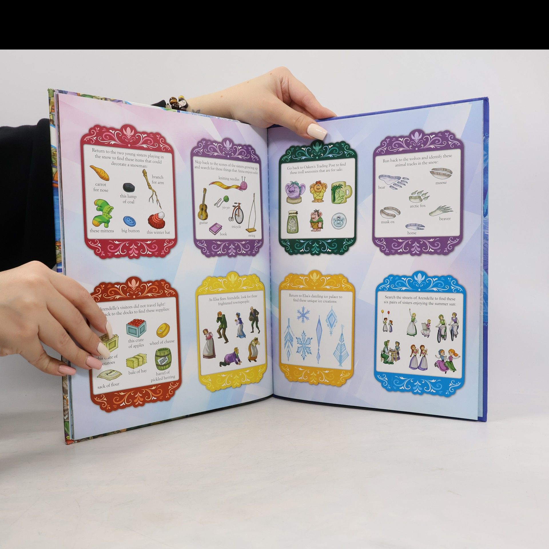 Come along with Anna, Elsa, and their friends on an icy adventure! Look for hidden objects in eight exciting Look and Find scenes inspired by the Disney Frozen Film. Then turn to the back of the book for even more challenges.