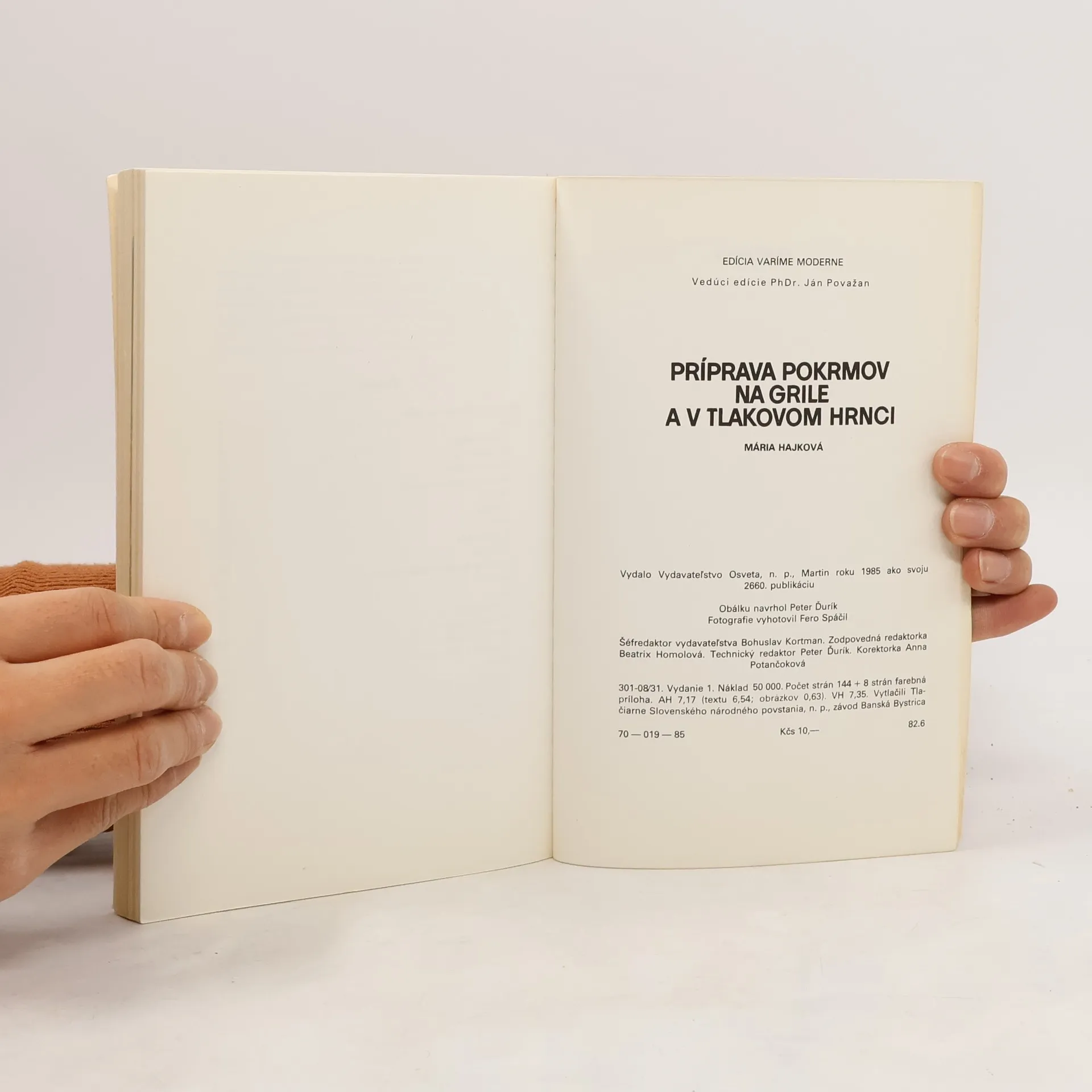 Príprava pokrmov na grile-mäsá-teľacie, hovädzie, bravčové, baranie a jahňacie, hydina, zverina, ryby, vnútornosti, údeniny. Príprava pokrmov v tlakovom hrnci-polievky, mäsá-teľacie, hovädzie, bravčové, baranie a jahňacie, hydina, zverina, ryby, vnútornosti, rozličné pokrmy. Prvé vydanie. Cena knihy v čase vydania: 10.- Kčs.