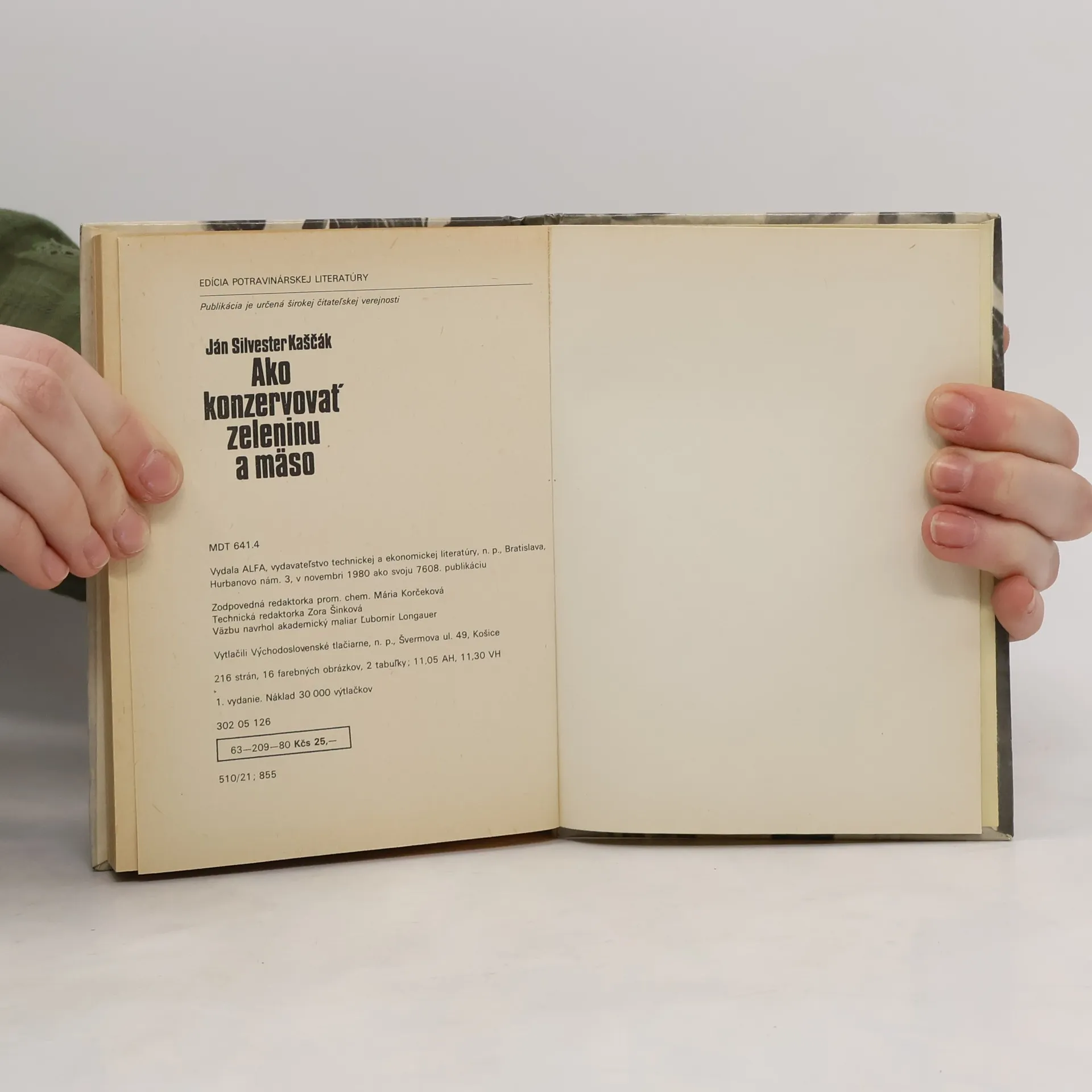 Publikácia svojím obsahom nadväzuje na príručku Ako konzervovať ovocie. Uvádza spôsob konzervovania a nakladania zeleniny a mäsa aj s prípravou suroviny. Zaujímavá je aj kapitola o ovocných a zeleninových šťavách. Opisuje sa v nej aj príprava niektorých vyhľadávaných zakáľačkových výrobkov. Kapitoly: Chemické zloženie zeleniny, Príčiny znehodnotenia zeleniny, Význam konzervovania zeleniny, Prísady a pomocné látky používané pri konzervovaní, Obaly a ich príprava, Konzervovanie zeleniny, Marinovaná zelenina, Ovocné a zeleninové šťavy vo výžive, ich získavanie a spracovanie, Receptúry nápojov ovocných a zeleninových štiav, Konzervovanie zeleniny a zeleninových vňatí solením, Sušenie zeleniny, Uschovávanie zeleniny v čerstvom stave, Mrazenie zeleniny, Konzervovanie húb, Konzervovanie vajec, Konzervovanie mäsa. Druhé vydanie. Cena knihy v čase vydania: 25.- Kčs.
