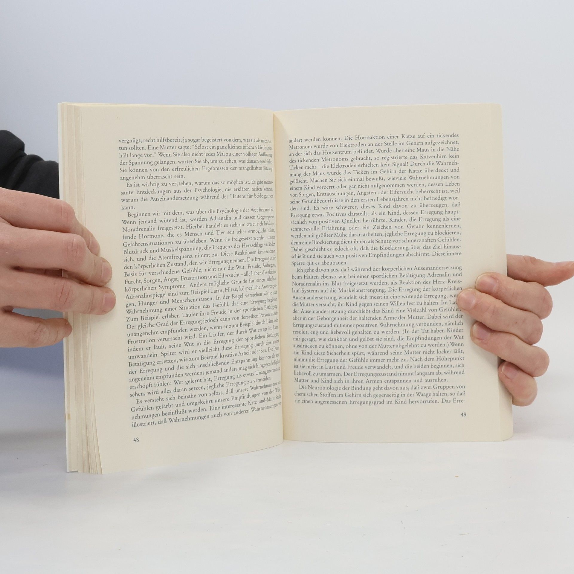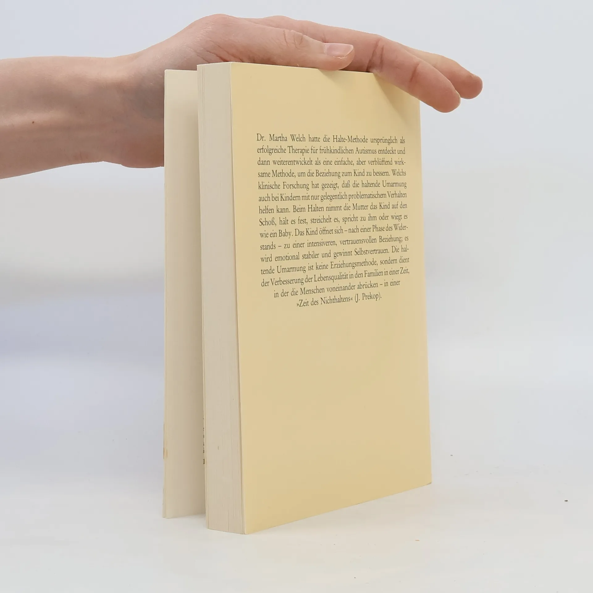 Dr. Martha Welch entdeckte die Halte-Methode ursprünglich als Therapie für frühkindlichen Autismus und entwickelte sie weiter zu einer einfachen, aber effektiven Methode zur Verbesserung der Beziehung zwischen Eltern und Kind. Ihre klinische Forschung zeigt, dass das Halten auch bei Kindern mit gelegentlichen Verhaltensproblemen hilfreich ist. Dabei sitzt die Mutter mit dem Kind auf dem Schoß, hält es fest, streichelt es, spricht mit ihm oder wiegt es wie ein Baby. Nach anfänglichem Widerstand öffnet sich das Kind und entwickelt eine intensivere, vertrauensvolle Beziehung, wird emotional stabiler und gewinnt Selbstvertrauen. Die Widerstandsphase hat in der Fachpresse für Kontroversen gesorgt, da wichtige Informationen zur Halte-Methode fehlten. Die Übersetzung des amerikanischen Originals soll diese Lücke schließen. Die haltende Umarmung ist keine Erziehungsmethode, sondern zielt darauf ab, die Lebensqualität in Familien zu verbessern, besonders in einer Zeit, in der Menschen sich voneinander entfernen. Dr. Welch, selbst Mutter, hat ein systematisches Programm entwickelt, das für jede Mutter nachvollziehbar ist. Ein praxisorientiertes Kapitel beantwortet häufige Fragen zur Methode und bietet Kontrolltests an.