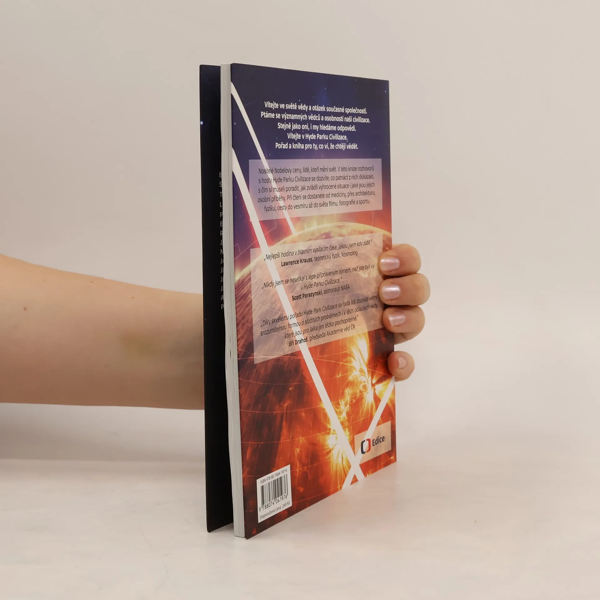Vítejte ve světě vědy a otázek současné společnosti. Ptáme se významných vědců a osobností naší civilizace. Vítejte v Hyde Parku Civilizace. Stejně jako oni, i my hledáme odpovědi. Pořad a kniha pro ty, co ví, že chtějí vědět.Nositelé Nobelovy ceny, lidé, kteří mění svět. V této knize rozhovorů s hosty Hyde Parku Civilizace se dozvíte, co patnáct z nich dokázalo, s čím si museli poradit, jak zvládli vyhrocené situace i jaké jsou jejich osobní příběhy. Při čtení se dostanete od medicíny, přes architekturu, fyziku, cesty do vesmíru až do světa filmu, fotografie a sportu. Daniel Stach hovoří v knize s následujícími osobnostmi: Bohdan Pomahač - plastický chirurg Scott Parazynski - astronaut, NASA Tomáš Radil - bývalý vězeň koncentračního tábora Osvětim Lawrence Krauss - teoretický fyzik, kosmolog Philip Zimbardo - psycholog, autor Stanfordského vězeňského experimentu Eva Jiřičná - architektka Rick McCallum - producent Hvězdných válek Jan Šibík - fotograf Natalia Gorbaněvská - disidentka Jerome Friedman - nositel Nobelovy ceny za fyziku Jiří Markovič - bývalý šéf pražského oddělení vyšetřování vražd Jiří Ježek - hendikepovaný cyklista Jan Říha - nevidomý horolezec Adam Dolník - odborník na terorismus Paul Nurse - nositel Nobelovy ceny za fyziologii Nezkrácené rozhovory si můžete vyhledat na webu ČT podle dat nebo QR kódů uvedených u každého rozhovoru. Speciální QR kódy navigují k rozhovorům vedeným v angličtině.