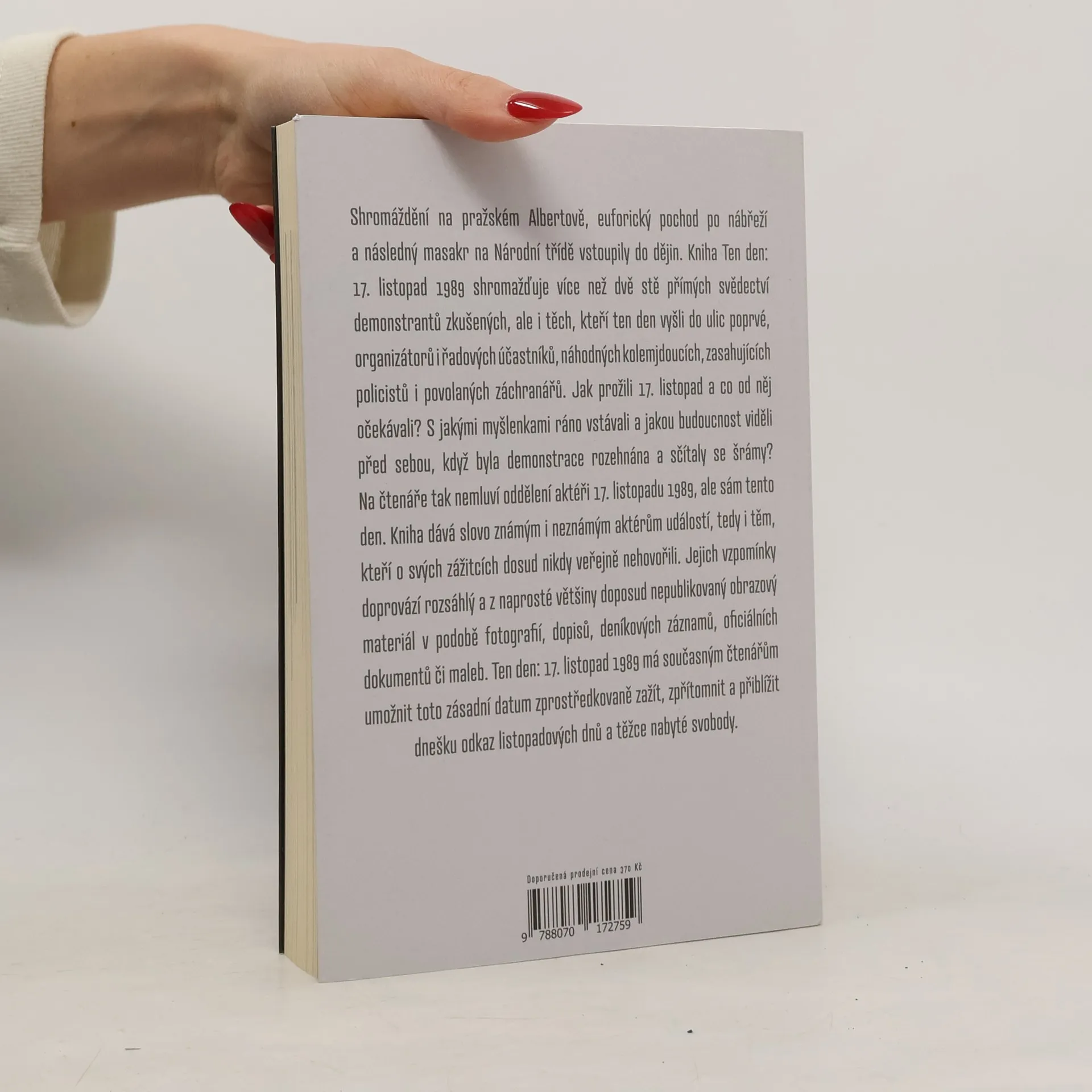 Shromáždění na pražském Albertově, euforický pochod po nábřeží a následný masakr na Národní třídě vstoupily do dějin. Kniha Ten den: 17. listopad 1989 shromažďuje více než dvě stě přímých svědectví demonstrantů zkušených, ale i těch, kteří ten den vyšli do ulic poprvé, organizátorů i řadových účastníků, náhodných kolemjdoucích, zasahujících policistů i povolaných záchranářů. Jak prožili 17. listopad a co od něj očekávali? S jakými myšlenkami ráno vstávali a jakou budoucnost viděli před sebou, když byla demonstrace rozehnána a sčítaly se šrámy? Na čtenáře tak nemluví oddělení aktéři 17. listopadu 1989, ale sám tento den. Dává slovo známým i neznámým aktérům událostí, tedy i těm, kteří o svých zážitcích dosud nikdy veřejně nehovořili. Jejich vzpomínky doprovází rozsáhlý a z naprosté většiny doposud nepublikovaný obrazový materiál v podobě fotografií, dopisů, deníkových záznamů, oficiálních dokumentů či maleb. Ten den: 17. listopad 1989 má současným čtenářům umožnit toto zásadní datum zprostředkovaně zažít, zpřítomnit a přiblížit dnešku odkaz revolučních dnů a těžce nabyté svobody.