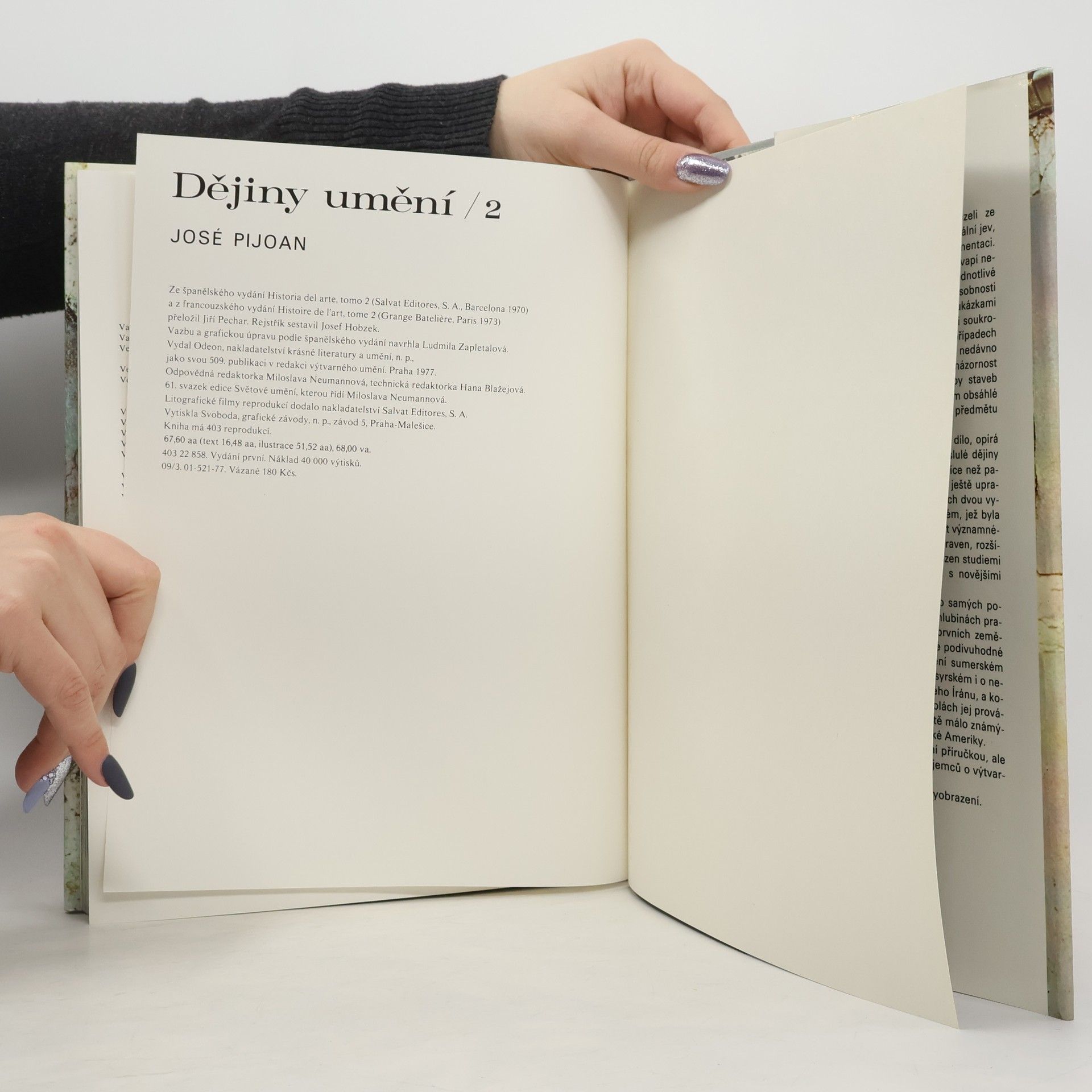 Toto rozsáhlé encyklopedické dílo čtenáře postupně seznámí s poklady světového umění. Opírá se o proslulé dějiny Josého Pijoana, které vyšly před téměř 70 lety. Čtenáři, milovníci umění, ocení bohatství obrazové dokumentace, na níž je dílo založeno. Vynikající barevné reprodukce představují jednotlivé kultury, epochy, umělecké proudy a osobnosti. Desetidílné Dějiny umění jsou určeny širokému okruhu zájemců o výtvarnou kulturu a kulturní historii. Druhý svazek je věnován antice. Samostatně může sloužit jako vynikající přehledná příručka dějin umění Řecka a Říma. Začíná líčením obdivuhodné kultury mínójské a mykénské, věnuje se archaickému umění Řecka, rozkvětu Athén a k helénismu Velkého Řecka. Zabývá se výtvarným umem Etrusků i vývojem římského umění až do jeho podního období.