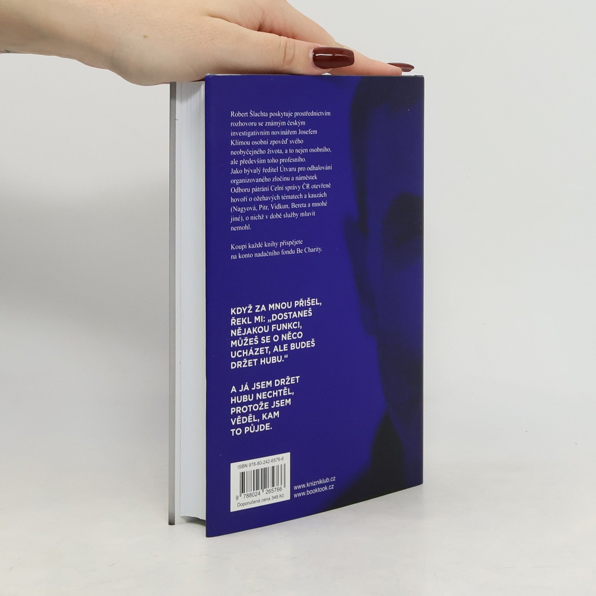 Robert Šlachta poskytuje prostřednictvím rozhovoru se známým českým investigativním novinářem Josefem Klímou osobní zpověď svého neobyčejného života, a to nejen osobního, ale především toho profesního. Jako bývalý ředitel Útvaru pro odhalování organizovaného zločinu a náměstek Odboru pátrání Celní správy ČR otevřeně hovoří o ožehavých tématech a kauzách (Nagyová, Pitr, Vidkun, Bereta a mnohé jiné), o nichž v době služby mluvit nemohl. Koupí každé knihy přispějete 50 Kč na konto nadačního fondu Be Charity.