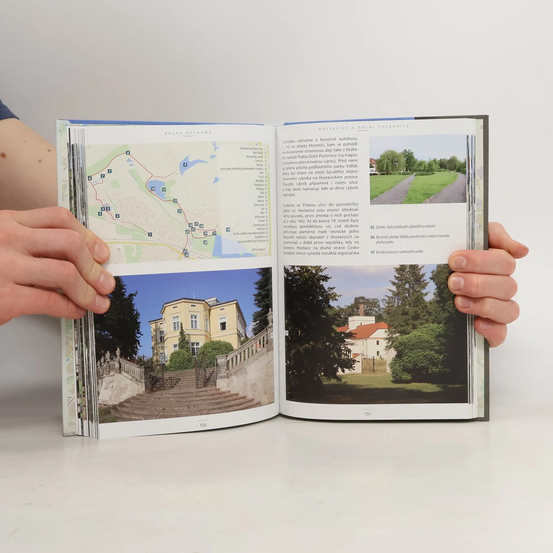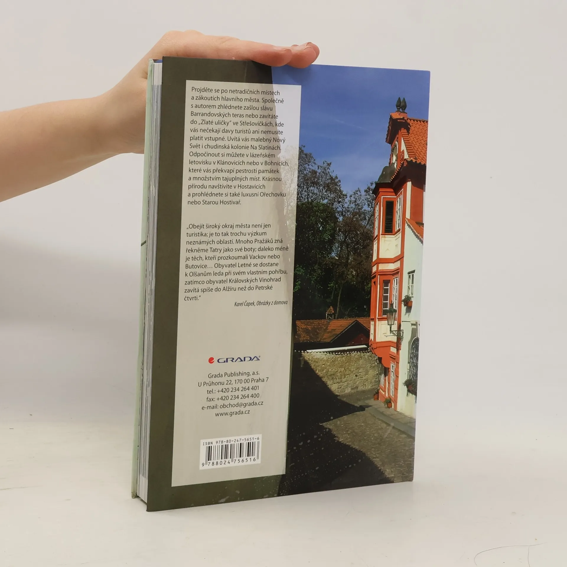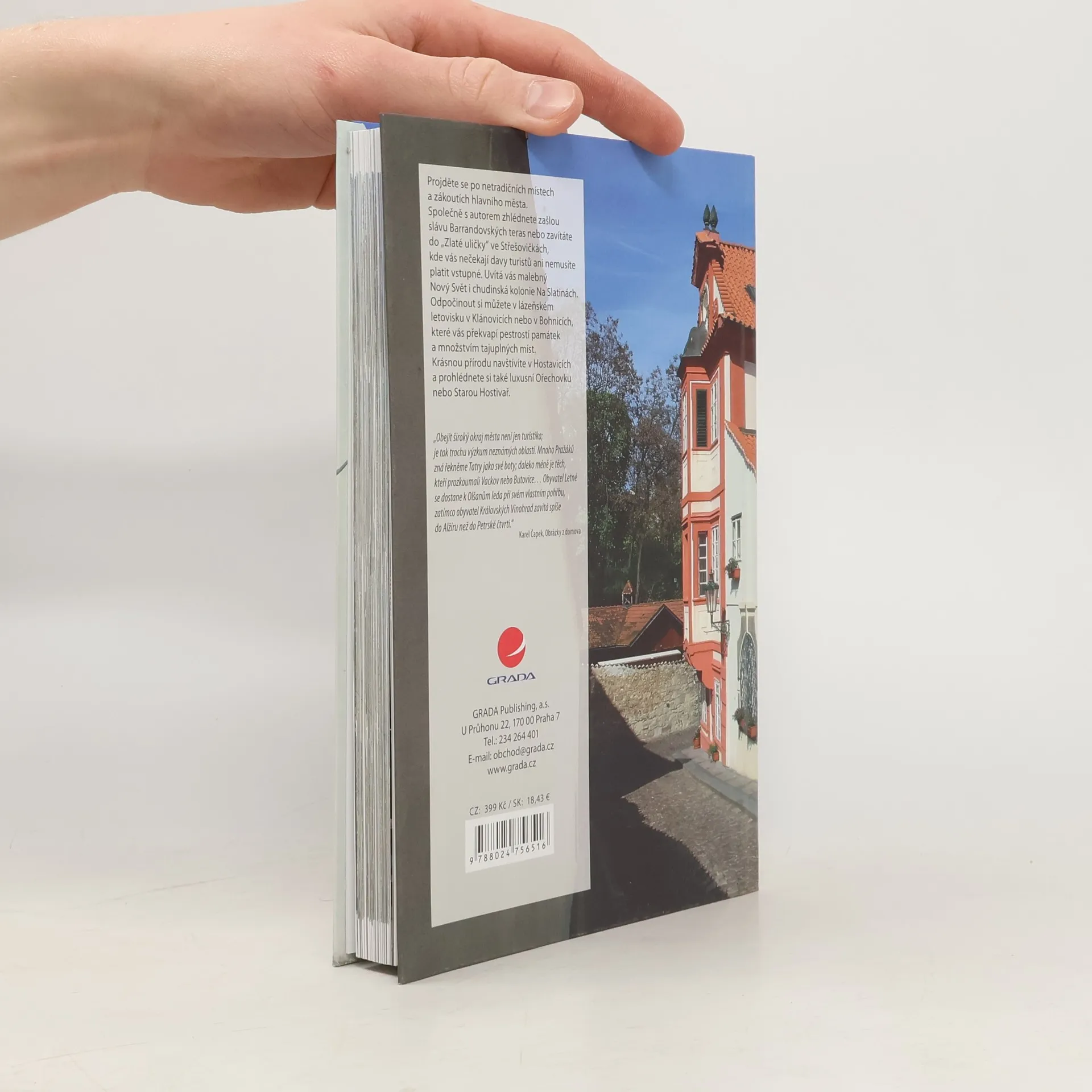 Projděte se po netradičních místech a zákoutích hlavního města. Společně s autorem zhlédnete zašlou slávu Barrandovských teras nebo zavítáte do „Zlaté uličky“ ve Střešovičkách, kde vás nečekají davy turistů ani nemusíte platit vstupné. Uvítá vás malebný Nový Svět i chudinská kolonie Na Slatinách. Odpočinout si můžete v lázeňském letovisku v Klánovicích nebo v Bohnicích, které vás překvapí pestrostí památek a množstvím tajuplných míst. Krásnou přírodu navštívíte v Hostavicích a prohlédnete si také luxusní Ořechovku nebo Starou Hostivař. „Obejít široký okraj města není jen turistika; je to tak trochu výzkum neznámých oblastí. Mnoho Pražáků zná řekněme Tatry jako své boty; daleko méně je těch, kteří prozkoumali Vackov nebo Butovice… Obyvatel Letné se dostane k Olšanům leda při svém vlastním pohřbu, zatímco obyvatel Královských Vinohrad zavítá spíše do Alžíru než do Petrské čtvrti.“ Karel Čapek, Obrázky z domova