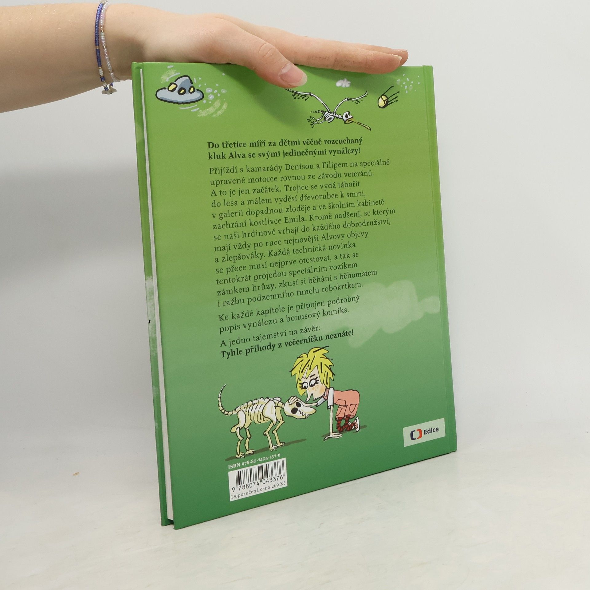 Do třetice míří za dětmi věčně rozcuchaný kluk Alva se svými jedinečnými vynálezy! Přijíždí s kamarády Denisou a Filipem na speciálně upravené motorce rovnou ze závodu veteránů. A to je jen začátek. Trojice se vydá tábořit do lesa a málem vyděsí dřevorubce k smrti, v galerii dopadnou zloděje a ve školním kabinetě zachrání kostlivce Emila. Kromě nadšení, se kterým se naši hrdinové vrhají do každého dobrodružství, mají vždy po ruce nejnovější Alvovy objevy a zlepšováky. Každá technická novinka se přece musí nejprve otestovat, a tak se tentokrát projedou speciálním vozíkem zámkem hrůzy, zkusí si běhání s běhomatem i ražbu podzemního tunelu robokrtkem. Ke každé kapitole je připojen podrobný popis vynálezu a bonusový komiks. Nové příhody, které z večerníčku neznáte!