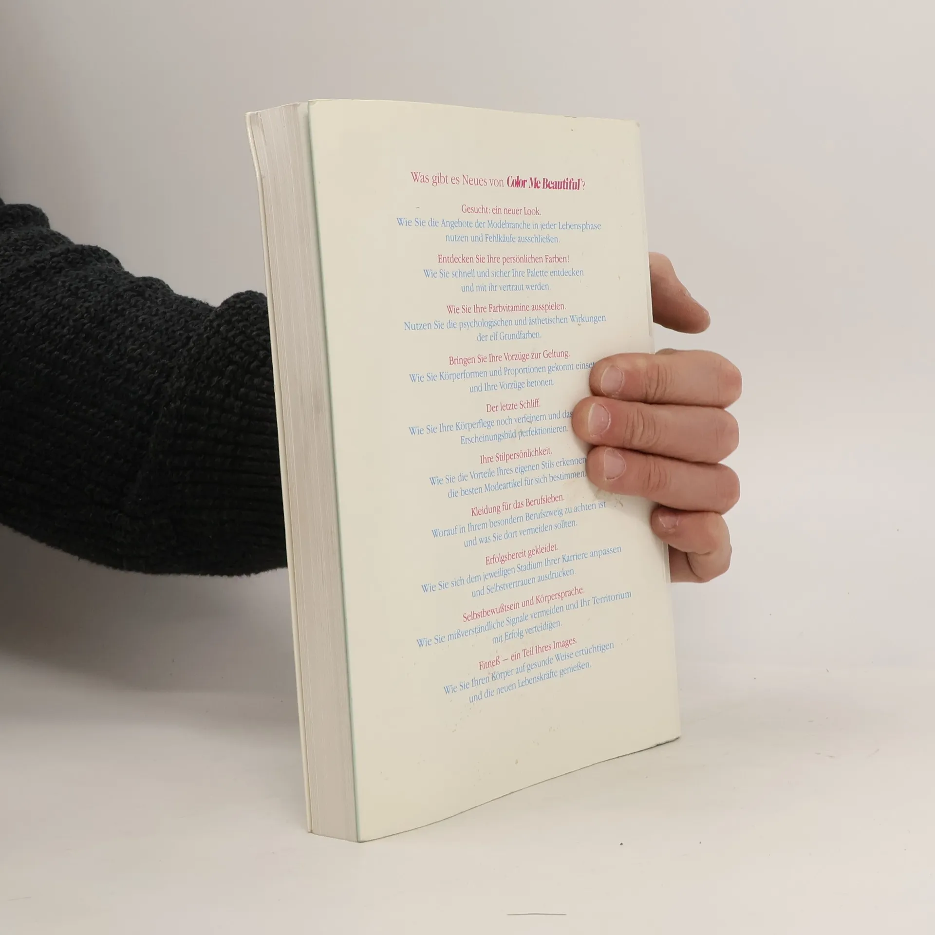 Ähnlich wie C. Jackson: "Color me beautiful" (BA 2/86) teilt die Autorin die verschiedenen Frauentypen je nach Kombination von Haar-, Augen- und Hautfarbe in Jahreszeitentypen ein, wobei die klassischen 4 Typen auf 12 erweitert wurden, d.h. es gibt je 3 Frühlings-, Sommer-, Herbst- und Wintertypen. Vorgestellt wird jeweils eine Palette von Idealfarben für die verschiedenen Typen. Zusätzlich wird auf die psychologische Wirkung bestimmter Farben eingegangen. Jedoch nicht nur die Farbe ist entscheidend für ein perfektes Outfit, sondern auch der richtige Kleidungsstil, abhängig von Grösse, Körperform usw., ebenso das Make-up, die Frisur, Schmuck und weitere Accessoires. Ein nützlicher, umfassender Ratgeber in übersichtlicher, ansprechender Aufmachung