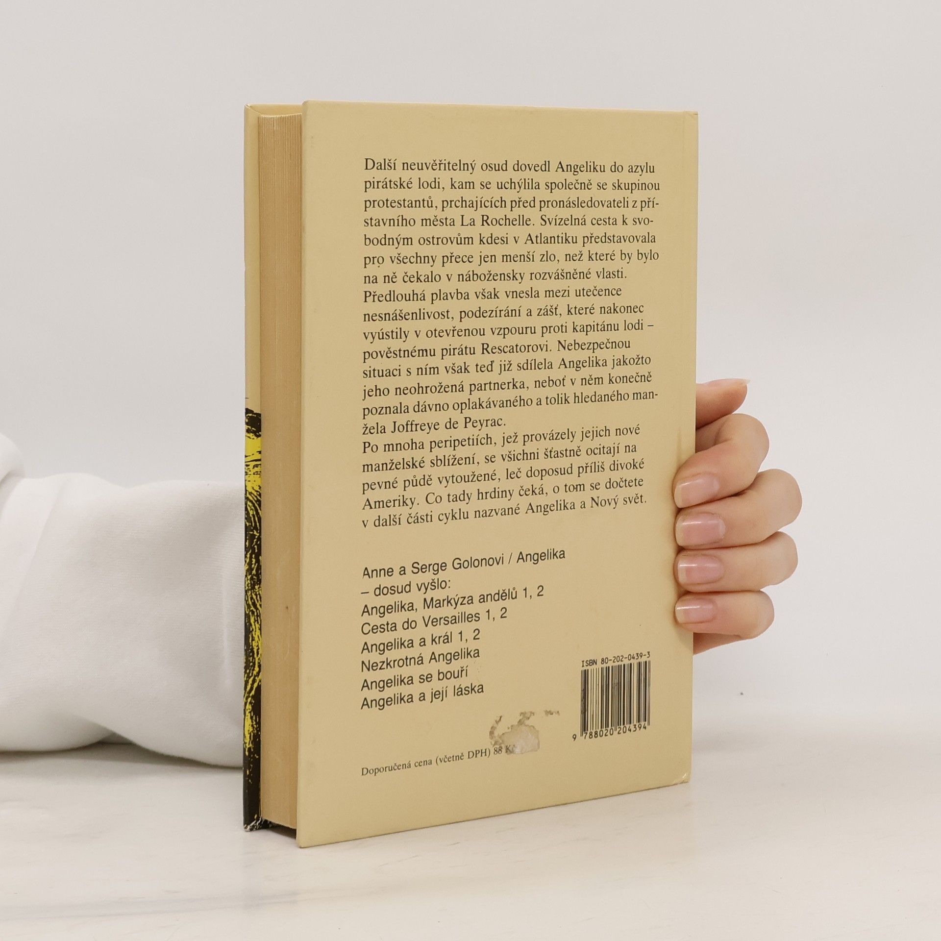 Další neuvěřitelný osud dovedl Angeliku do azylu pirátské lodi, kam se uchýlila společně se skupinou protestantů, prchající před pronásledovateli z přístavního města La Rochelle. Svízelná cesta k svobodným ostrovům kdesi v Atlantiku představovala pro všechny přece jen menší zlo, než které by bylo na ně čekalo v nábožensky rozvášněné vlasti. Z francouzského originálu Angélique et son amour, vydaného nakladatelstvím Opera Mundi, Paris 1960, přeložila Hana Müllerová. Vydání první.