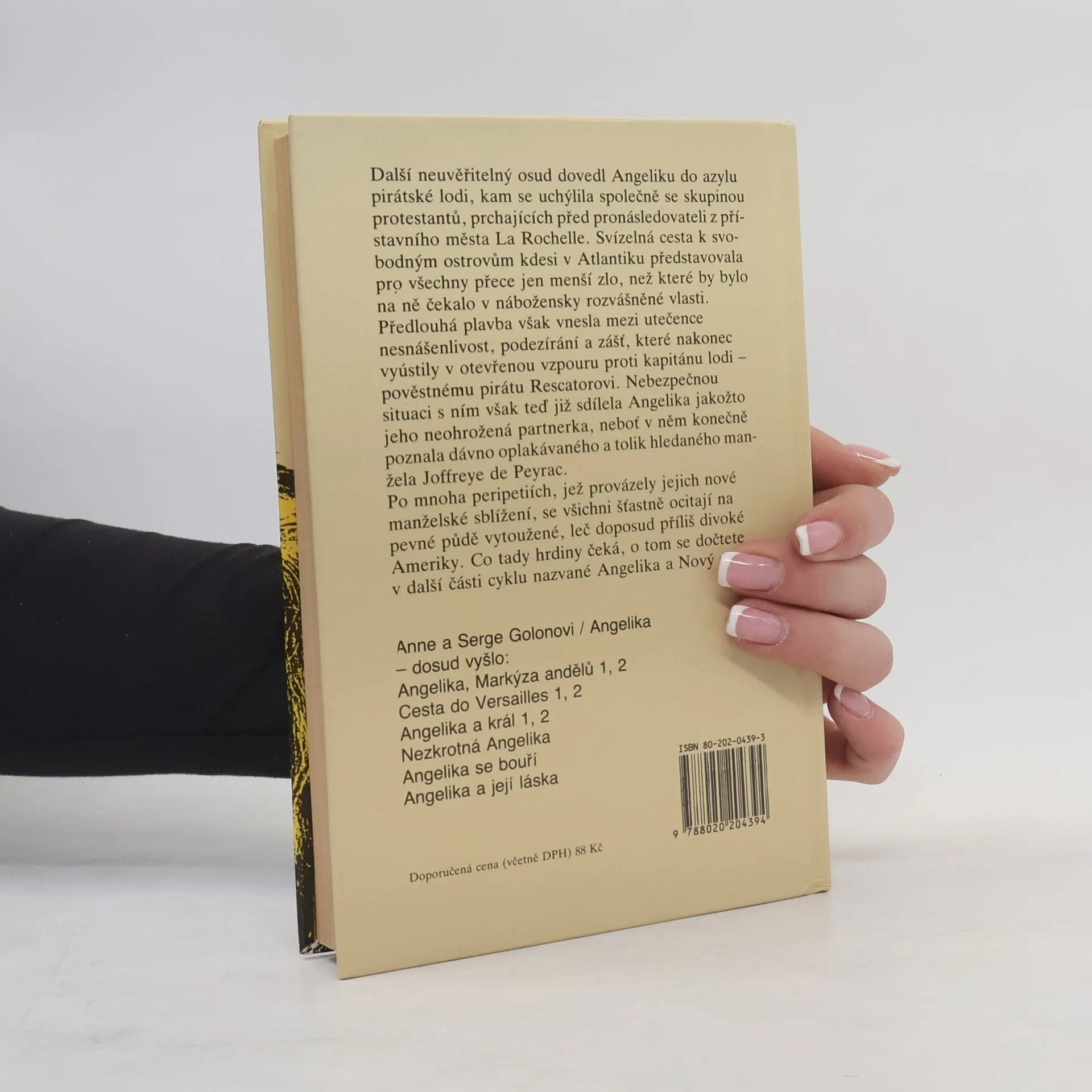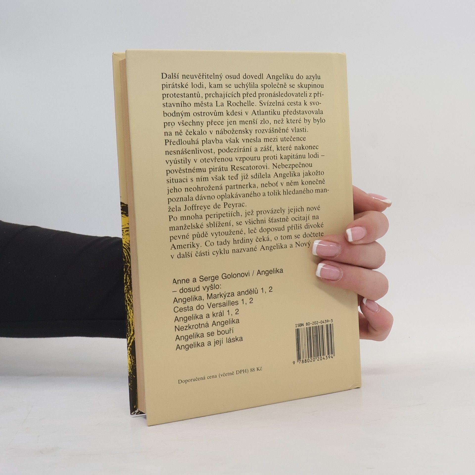 Další neuvěřitelný osud dovedl Angeliku do azylu pirátské lodi, kam se uchýlila společně se skupinou protestantů, prchající před pronásledovateli z přístavního města La Rochelle. Svízelná cesta k svobodným ostrovům kdesi v Atlantiku představovala pro všechny přece jen menší zlo, než které by bylo na ně čekalo v nábožensky rozvášněné vlasti. Z francouzského originálu Angélique et son amour, vydaného nakladatelstvím Opera Mundi, Paris 1960, přeložila Hana Müllerová. Vydání první.