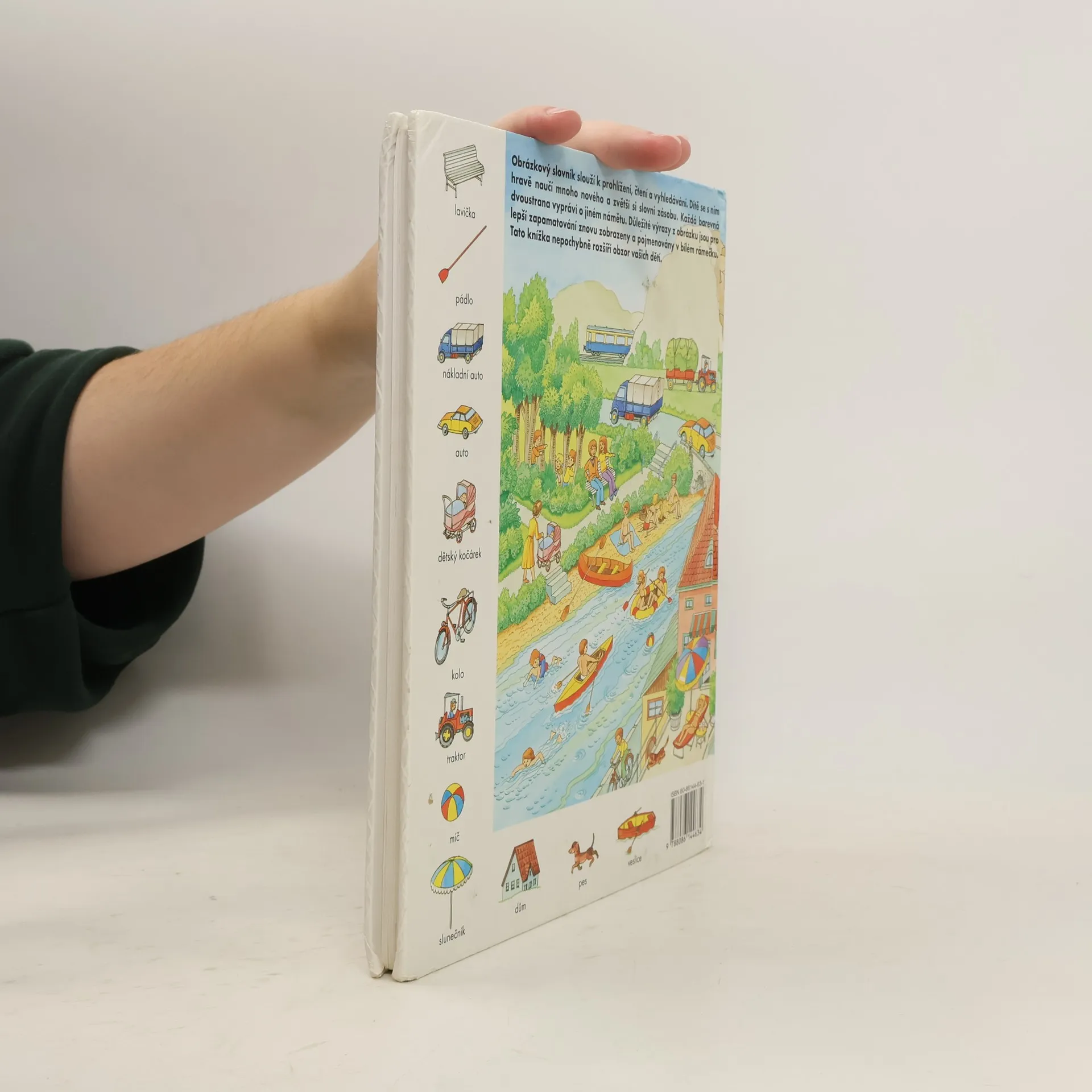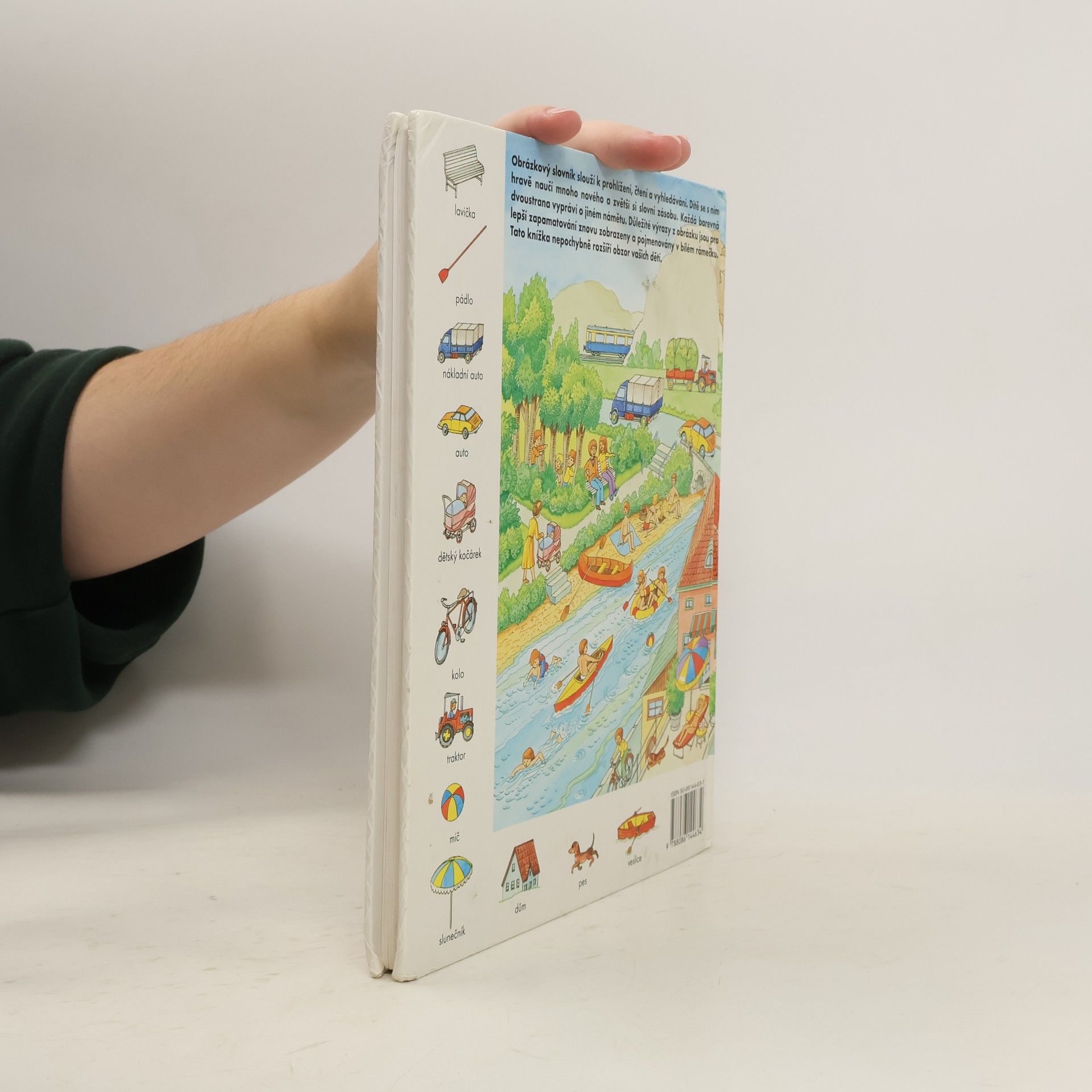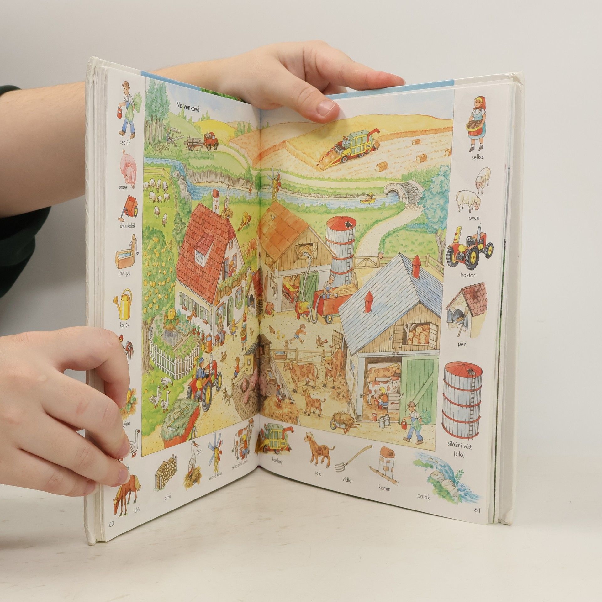 Zvídavým i zvědavým dětem nabízíme 44 dvoustran s nejrůznějšími výjevy z daného prostředí (pole, dvůr, dům, byt, obchod, cesta, letiště...), na okraji doplněné malými obrázky s názvy předmětů patřících do tohoto prostředí. Přednosti této názorné pomůcky k rozvíjení poznatků a rozumových schopností dětí předškolního i mladšího školního věku.