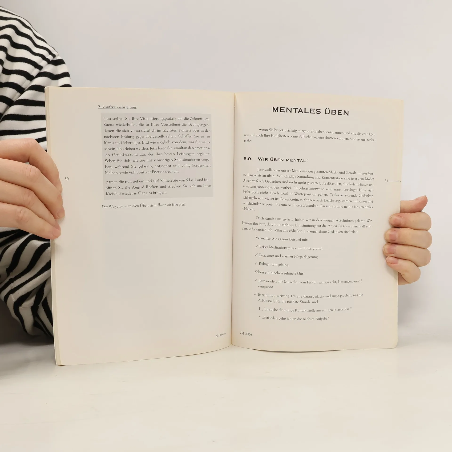 In ihrem Buch beschreibt die Autorin systematische Techniken zur Entspannung und gibt zahlreiche Anregungen zur Gestaltung und zum zeitlichen Ablauf des Übens. Mentales Training kann nicht das Üben mit dem Instrument ersetzen, kann aber „un-sinniges“ Abspulen und den Aufbau von Angststellen verhindern helfen. Das Buch räumt mit überholten Vorstellungen von der Übearbeit auf und versucht, sie durch effektivere zu ersetzen. Ein umfangreiches Literaturverzeichnis gibt Anregungen zur Weiterarbeit und Vertiefung in einzelnen Bereichen.