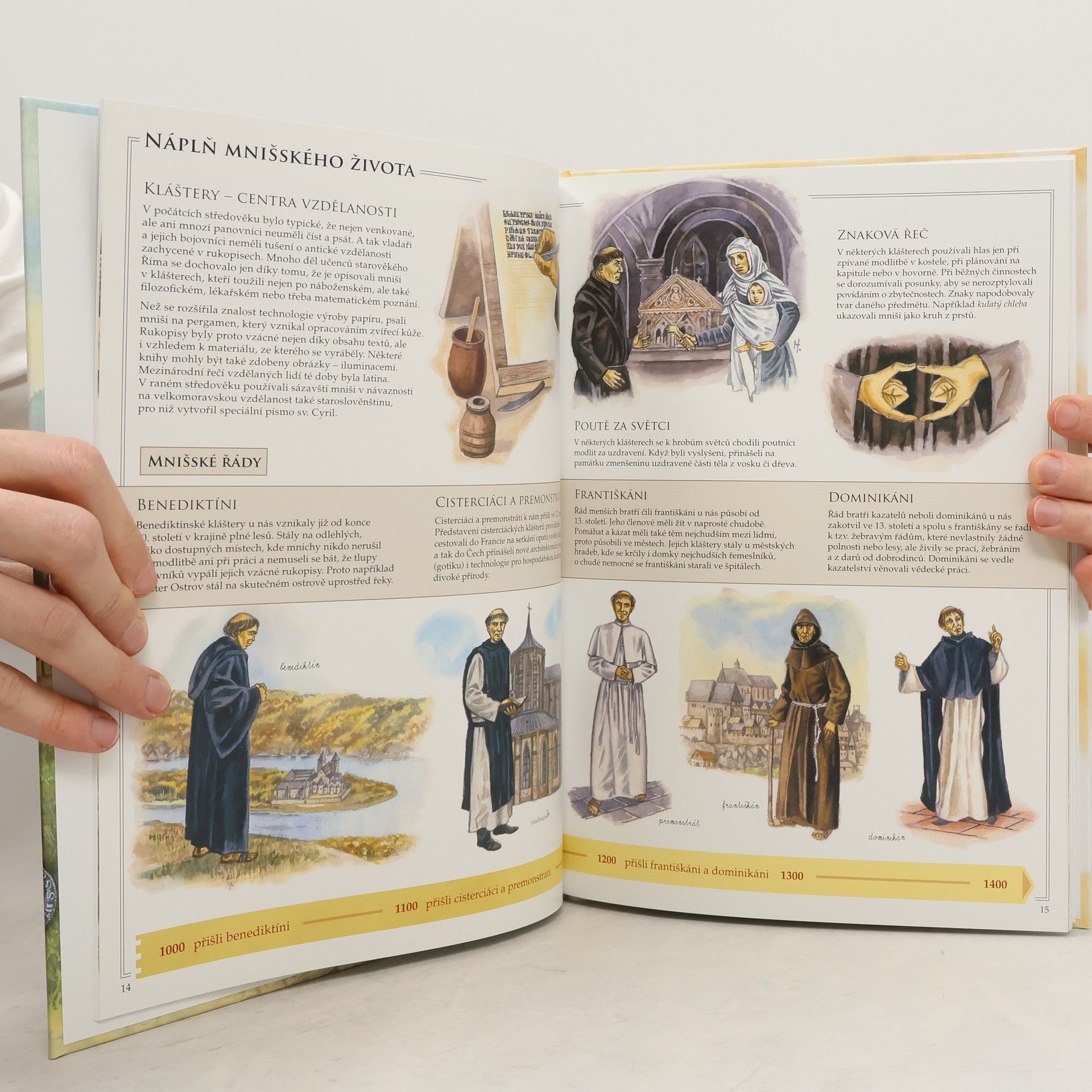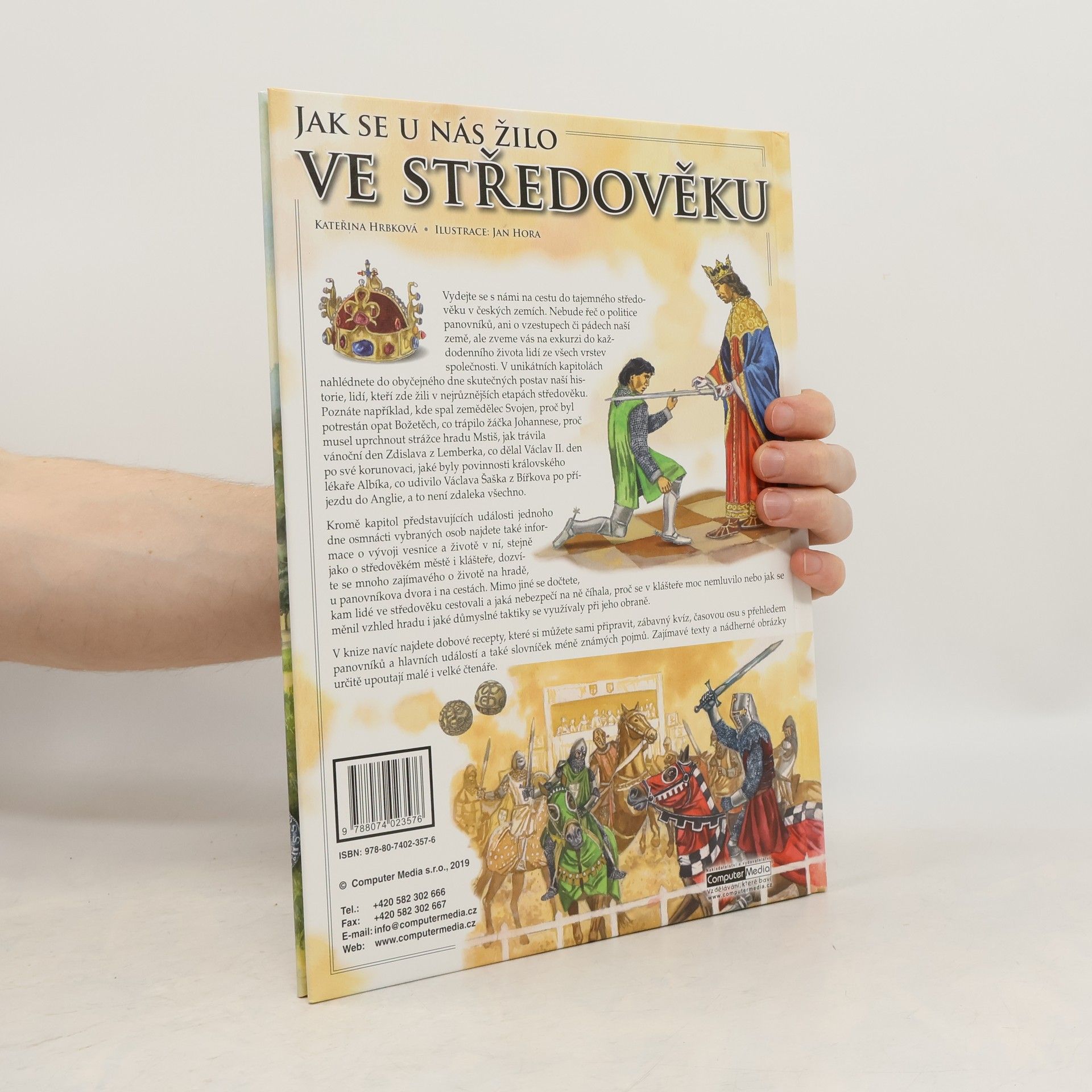 Vydejte se na cestu do tajemného středověku v českých zemích, kde se zaměříme na každodenní život lidí ze všech vrstev společnosti, nikoli na politiku panovníků. V unikátních kapitolách nahlédnete do obyčejného dne skutečných postav naší historie, jako je zemědělec Svojen, opat Božetěch, žáček Johannes, strážce hradu Mstiš, nebo Zdislava z Lemberka, a mnoho dalších. Dozvíte se, co dělal Václav II. den po své korunovaci, jaké byly povinnosti královského lékaře Albíka, a s Václavem Šaškem z Bířkova se podíváte na cestu do Anglie. Kromě příběhů 18 vybraných osobností se seznámíte s vývojem vesnice, životem ve městě a klášteře, a také s životem na hradě či u panovníkova dvora. Zjistíte, kam lidé ve středověku cestovali, jaká nebezpečí je na cestách čekala, a proč se v klášteře moc nemluvilo. Kniha obsahuje dobové recepty, zábavný kvíz, časovou osu s přehledem panovníků a hlavních událostí, a slovníček méně známých pojmů. Zajímavé texty a nádherné obrázky jistě upoutají malé i velké čtenáře.