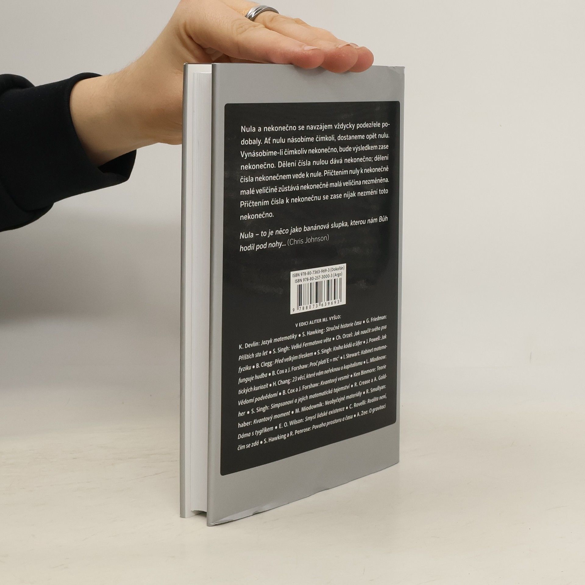 Tato kniha je historií nuly. Zrodila se ve starověku a posléze se jí podařilo vybojovat si místo na slunci na Východě, s prosazením na Západě to však měla mnohem obtížnější. Možná proto se naší civilizaci dodnes mstí a neustále působí nové a nové potíže - od havárií řídících systémů až po fundamentální problémy v moderní fyzice. Stejně je však naše kniha i historií lidí, kteří po staletí s nulou bojovali a nakonec jí v nerovném boji podlehli učenců a mystiků, vědců a kněží, všech těch, kdo se nule snažili porozumět a ovládnout ji. Je to příběh marných, někdy i násilných pokusů západního světa ochránit se před vlivem východních myšlenek. A je to také historie paradoxů, které s sebou přináší nevinně vypadající číslo, paradoxů, které mátly i nejchytřejší mozky minulého století a hrozily narušit vlastní základy vědeckého myšlení. Nula nakonec vždy zvítězila nad těmi, kdo se jí stavěli na odpor. Lidé ji nikdy nedokázali přinutit, aby se přizpůsobila jejich filozofiím, to ona utvářela naše názory na vesmír i na samotného Boha.