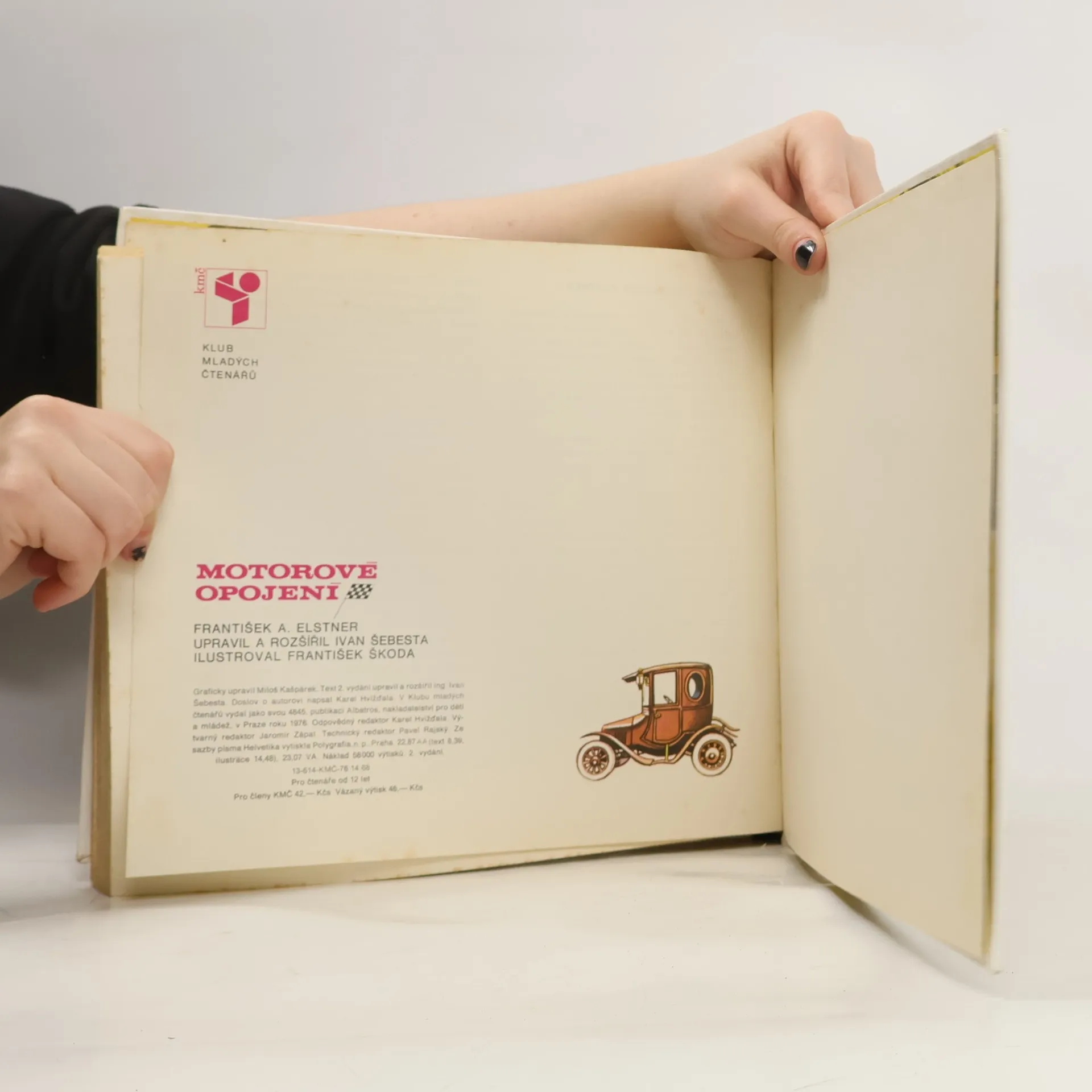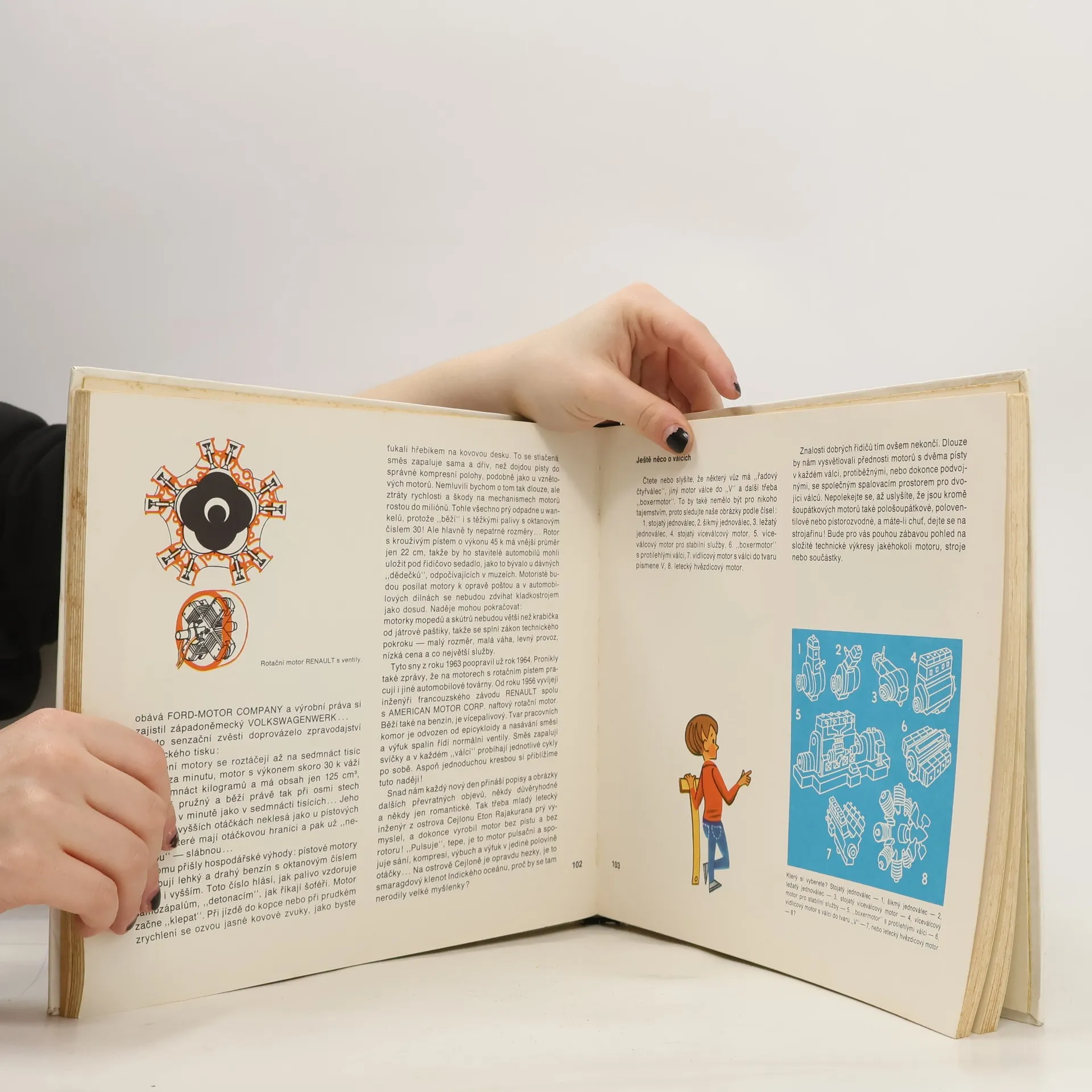 Vtipné vyprávění spolu s obrázky a dobovými fotografiemi uvádí do minulosti a současnosti motorismu. Srozumitelným způsobem autor hovoří o objevu parního stroje, o prvních automobilech a jejich konstruktérech a o počátcích výroby motocyklů a automobilů u nás. Názorně seznamuje s hlavnímisoučástmi a funkcí automobilového motoru. Uvádí stručný přehled vývoje automobilu v různých zemích i seznam nejúspěšnějších vozů světa v letech 1963–1975. Katalog všech možných značek motorových vozidel z celého světa. 2., upravené a rozšířené vydání