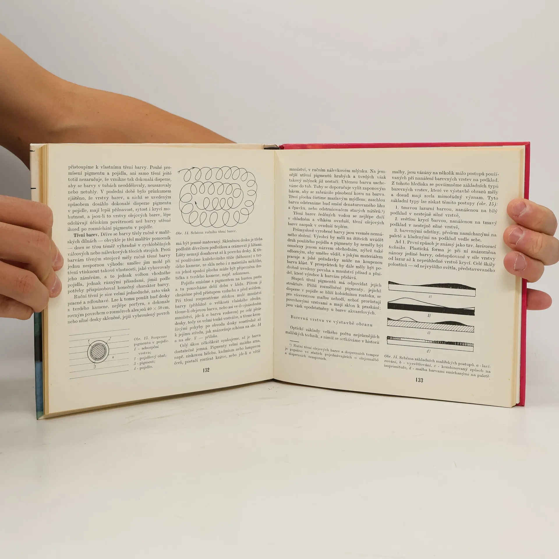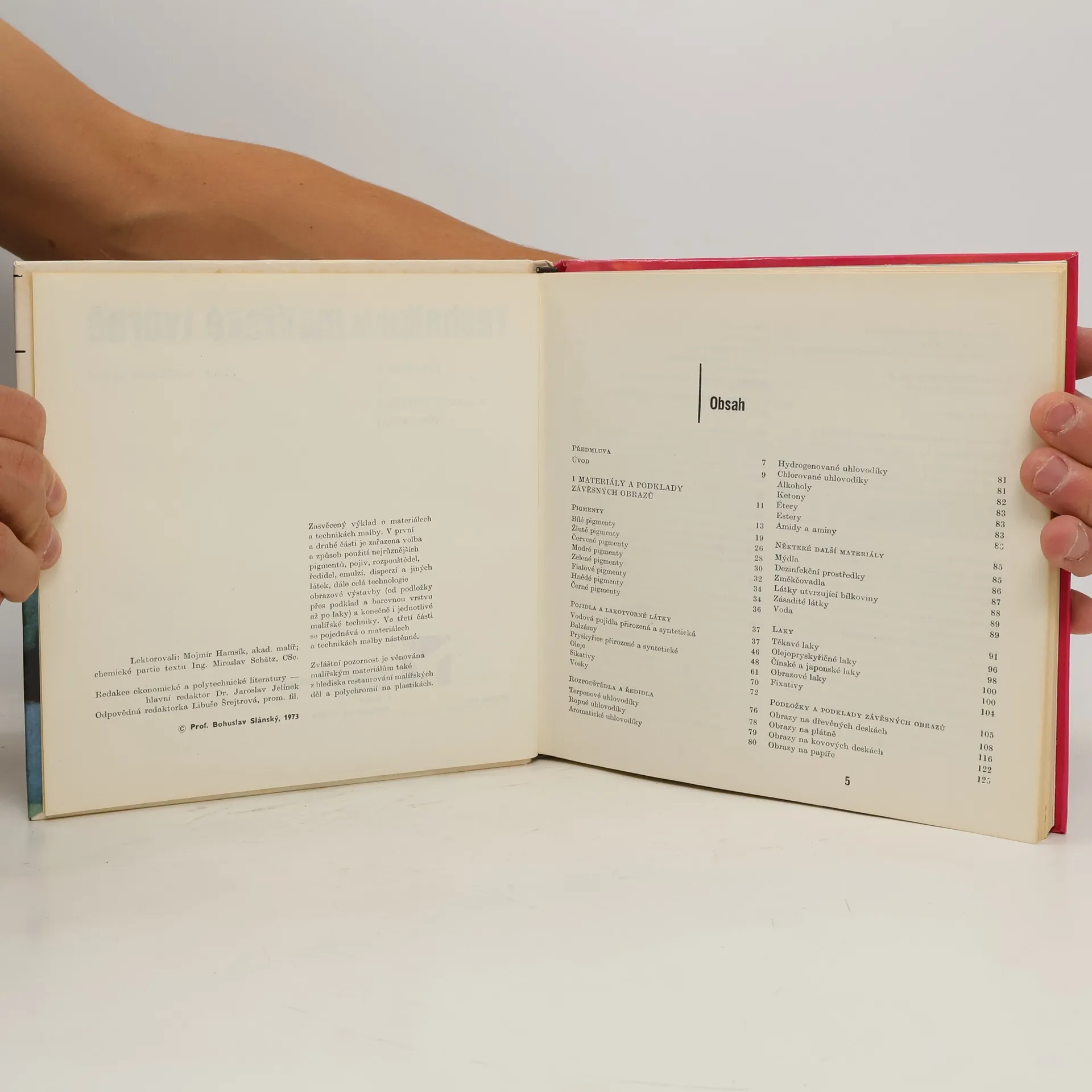 V první části práce vysvětluje restaurátor funkci, druhy a vlastnosti pigmentů, pojidel, rozpouštědel a ředidel, laků, podložek a podkladů pro závěsné obrazy. Druhou část věnuje technice malby těchto obrazů jednoduchýmivodovými barvami, temperou, disperzními a olejovými barvami. V poslední části se zabývá materiály, přípravou podkladu a technickým postupem při vytváření nástěnných maleb.