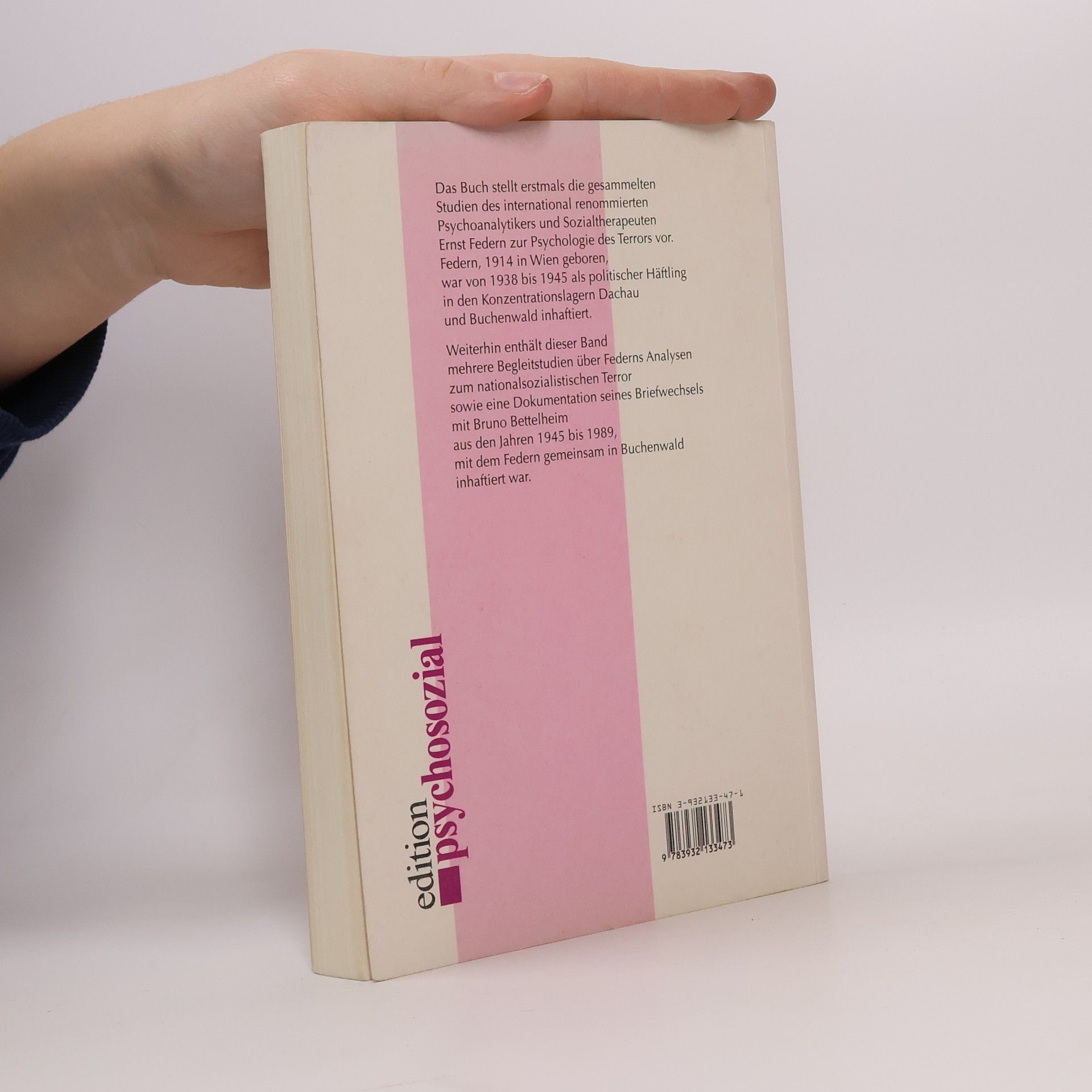 Das Buch stellt erstmals die gesammelten Studien des international renommierten Psychoanalytikers und Sozialtherapeuten Ernst Federn zur Psychologie des Terrors vor. Federn, 1914 in Wien geboren, wurde von 1938 bis 1945 als politischer Häftling in den Konzentrationslagern Dachau und Buchenwald inhaftiert. Weiterhin enthält dieser Band mehrere Begleitstudien über Federns Analysen zum nationalsozialistischen Terror sowie eine Dokumentation seines Briefwechsels mit Bruno Bettelheim aus den Jahren 1945 bis 1989, mit dem Federn gemeinsam in Buchenwald inhaftiert war.