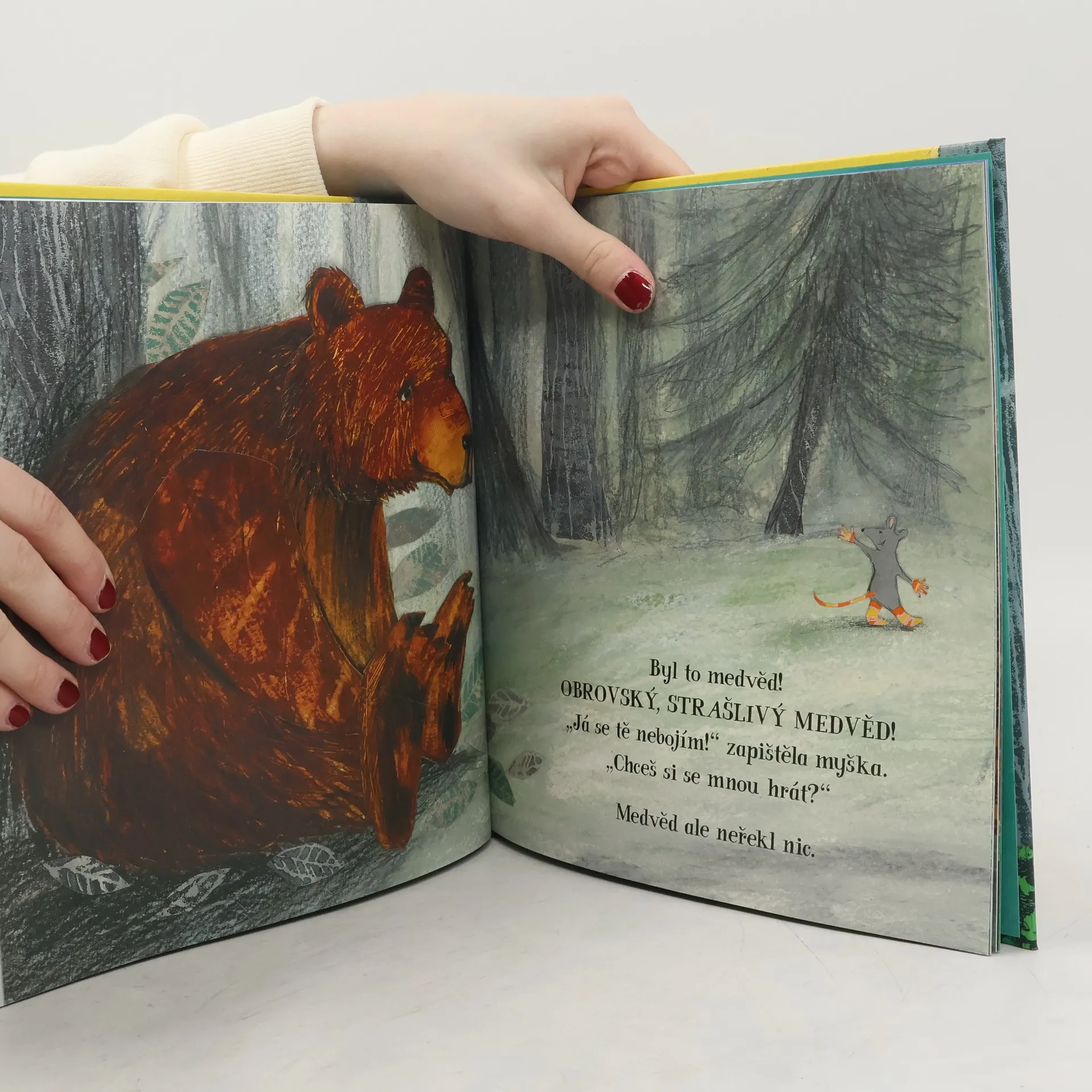 Jednoho rána se myška rozhodla, že půjde do lesa na průzkum. „Ničeho se neleknu,“ řekla ostatním zvířátkům. A opravdu, ani vlk, ani medvěd, a dokonce ani los ji nevystrašili. Jak to ale dopadlo, když v lesním domečku našla malé, bílé, chlupaté koťátko?
