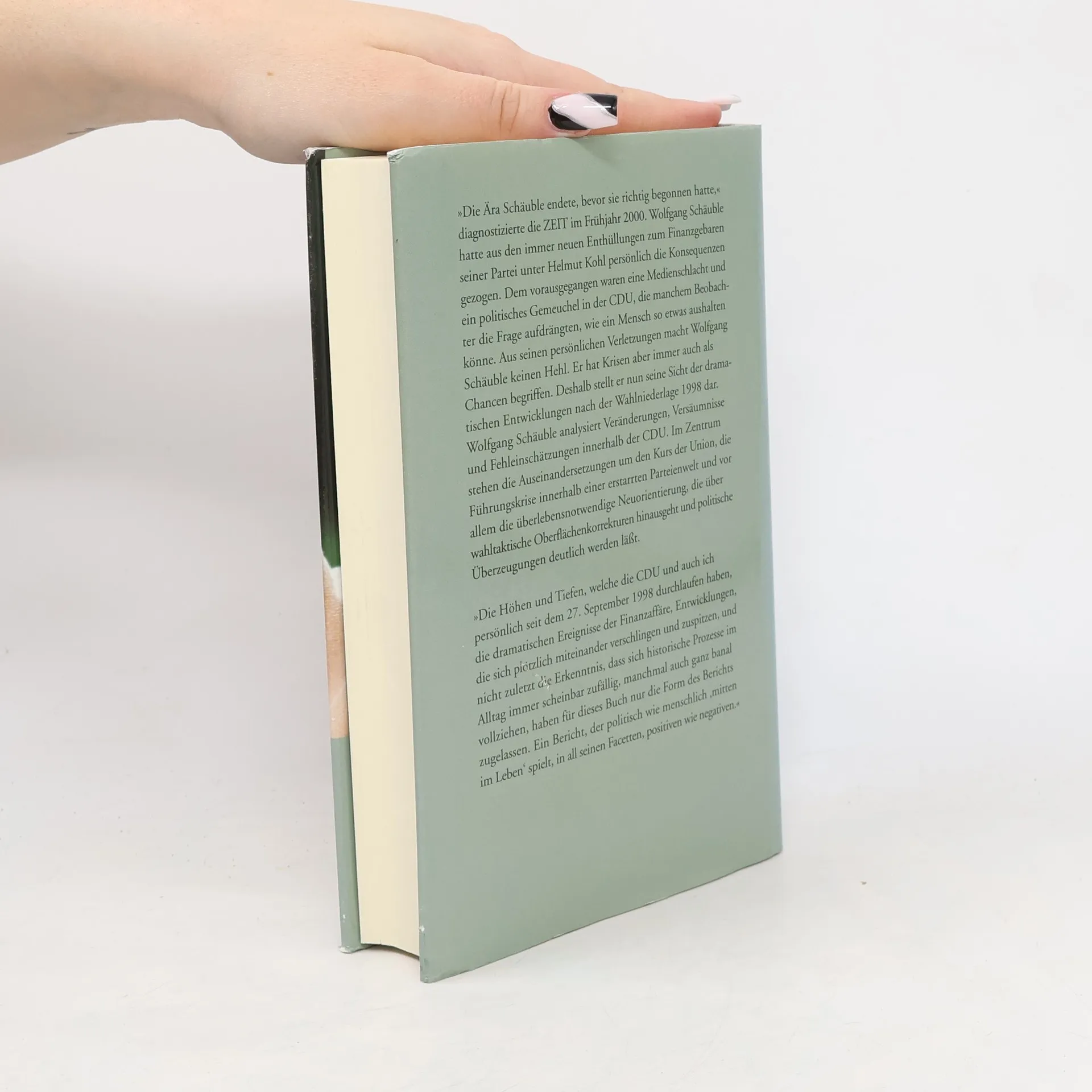 Die Ära Schäuble endete, bevor sie richtig begonnen hatte,„ diagnostizierte die “ZEIT„ im Frühjahr 2000. Wolfgang Schäuble hatte aus den immer neuen Enthüllungen zum Finanzgebaren seiner Partei unter Helmut Kohl persönlich die Konsequenzen gezogen. Dem vorausgegangen war eine Medienschlacht und ein politisches Gemeuchel in der CDU, die manchem Beobachter die Frage aufdrängten, wie ein Mensch so etwas aushalten kann. “BR" Persönliche Verletzungen wirken nach. Daraus macht Wolfgang Schäuble keinen Hehl. Doch er hat Krisen immer auch als Chancen begriffen. Deshalb stellt er nun seine Sicht der dramatischen Entwicklungen nach der Wahlniederlage 1998 dar. Im Zentrum stehen die Auseinandersetzung um den Kurs der Union, die Führungskrise innerhalb einer erstarrten Parteiwelt und vor allem die überlebensnotwendige Neuorientierung, die über wahltaktische Oberflächenkorrekturen hinausgeht. Dabei geht es Schäuble weniger um Enthüllungen oder Machtpoker als um Perspektiven für seine politischen Überzeugungen.