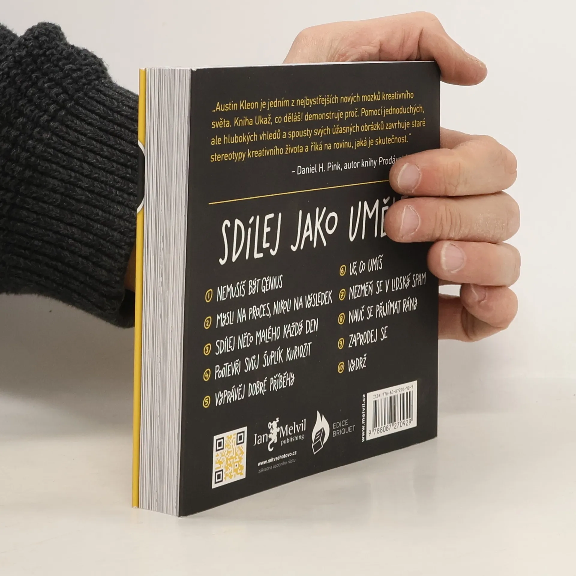 Pochodeň tvořivosti, kterou jste získali díky předchozí knize, nyní pokračuje s novými podněty. Austin Kleon opět přináší deset kapitol plných povzbuzení a nadšení pro tvorbu a její sdílení. Tentokrát se zaměřuje na to, že velkorysost vítězí nad géniem a že být vidět a umožnit ostatním, aby "kradli", je klíčem k tomu, stát se známým tvůrcem. Zatímco předchozí kniha nabádala k ovlivňování skrze díla jiných, nyní se zaměřuje na to, jak ovlivňovat ostatní sdílením vlastního díla. Naučíte se, proč a jak sdílet, a s kým. Kleon oslovuje i ty, kteří se zdráhají propagovat sami sebe, a ukazuje, jak představit svou práci a proces tvoření bez pocitu viny. Kniha je určena pro tvůrce, kteří se stydí za své úspěchy. Zjistíte, že nemusíte být génius, abyste mohli sdílet své dílo se světem. Každodenní sdílení vaší práce je cennější než skryté úsilí na životním díle. Objevíte, jak vyprávět příběhy o svých zajímavostech a získáte rady, jak se vyhnout přehnané propagaci a jak čelit obtížím. S pomocí úspěšných umělců minulosti i současnosti pochopíte, že kreativita je způsob myšlení, nikoli pouze talent.