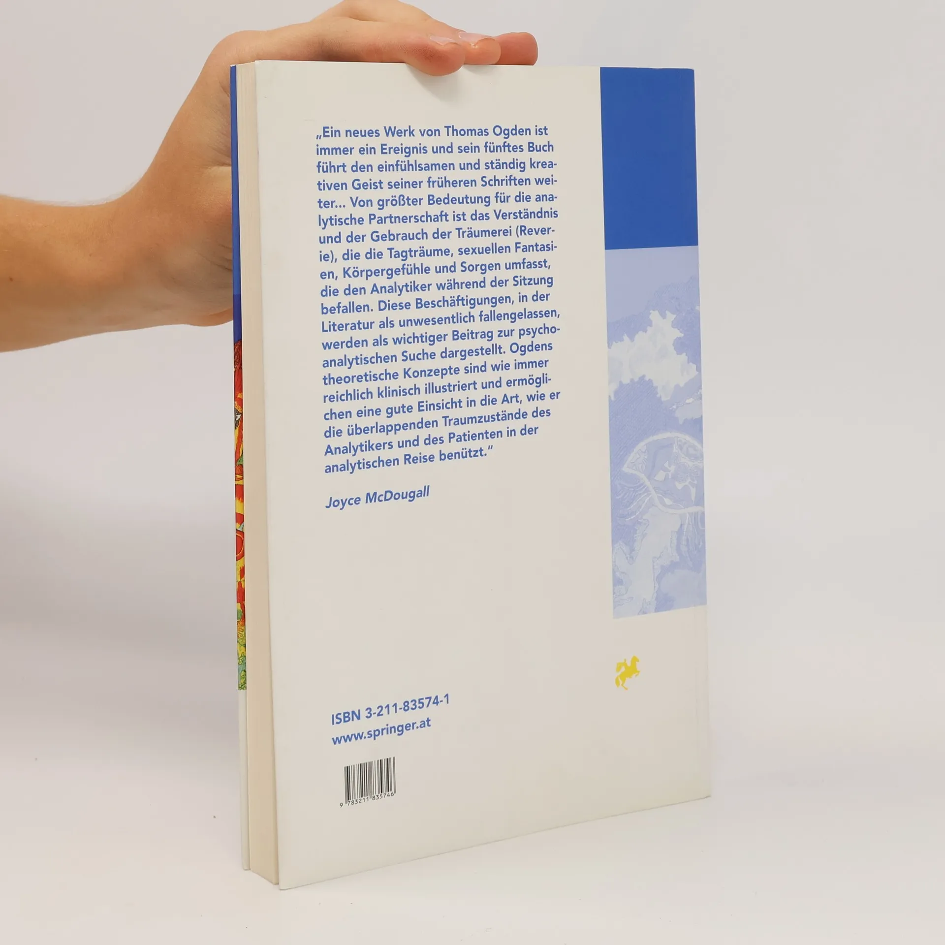Stimmen zur amerikanischen Originalausgabe: „Einer der führenden psychoanalytischen Theoretiker unserer Zeit seziert die Grundkomponenten der psychoanalytischen Situation in einer solchen Weise, daß der Leser die Psychoanalyse nie mehr wieder auf die selbe Art betrachten wird. Er stellt neue Überlegungen an über die Verwendung der Couch, den technischen Zugang zur Traumdeutung, das Bedürfnis des Klienten und Analytikers nach Zurückgezogenheit, den Gebrauch der Sprache und die Anatomie der Träumerei ...“ Glen O. Gabbard, M. D. „Ein neues Werk von Thomas Ogden ist immer ein Ereignis und sein fünftes Buch führt den einfühlsamen und ständig kreativen Geist seiner früheren Schriften weiter ... Von größter Bedeutung für die analytische Partnerschaft ist das Verständnis und der Gebrauch der Träumerei (Reverie), die die Tagträume, sexuellen Fantasien, Körpergefühle und Sorgen umfasst, die den Analytiker während der Sitzung befallen. Diese Beschäftigungen, in der Literatur als unwesentlich fallengelassen, werden als wichtiger Beitrag zur psychoanalytischen Suche dargestellt. Ogdens theoretische Konzepte sind wie immer reichlich klinisch illustriert und ermöglichen eine gute Einsicht in die Art, wie er die überlappenden Traumzustände des Analytikers und des Patienten in der analytischen Reise benützt.“ Joyce McDougall, Ed. D.
