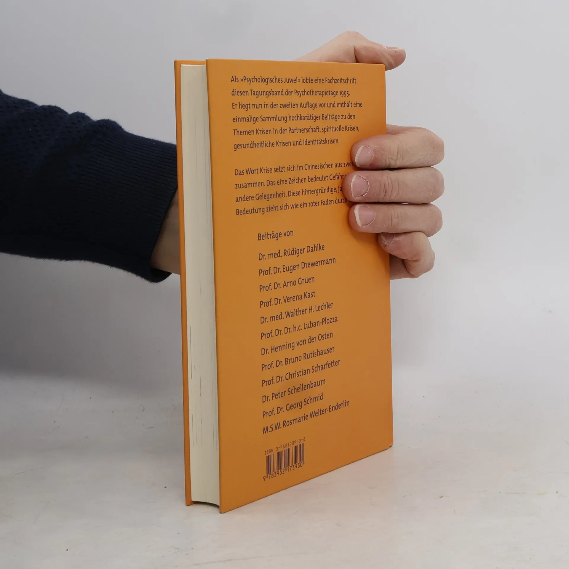 Die Autoren nehmen Stellung zu „Krisen in der Partnerschaft“, „Spirituelle Krisen“, „Gesundheitliche Krisen“ und „Identitätskrisen“. Diese Nachlese wurde von der Schweizer Psychologiezeitschrift INTRA als „psychologisches Juwel“ bezeichnet. Autoren und Beiträge Rüdiger Dahlke = Krisen des Gesundheitssystems Eugen Drewermann = Mit Krisen leben Arno Gruen = Die Schwierigkeit, sich selber zu sein Verena Kast = Krise am Höhepunkt des Lebens - Das Klimakterium der Frau Walther Lechler = Der Therapeut als Begleiter Boris Luban-Plozza = Der Arzt als Arznei Henning von der Osten = Muss Psychotherapie Religion werden? Bruno Rutishauser = Lieben und Arbeiten: Wenn Lieben nicht mehr rentiert Christian Scharfetter = Krisen auf dem Weg – Sogenannte spirituelle Krisen aus der Sicht eines Psychiaters Peter Schellenbaum = Das Nein in der Liebe Georg Schmid = Spiritualität als Therapie und Therapie als Spiritualität in den Krisen der modernen Zivilisation Rosemarie Welter-Enderlin = Romantische Liebe versus Partnerschaft – Kritische Übergänge im Tanz der Geschlechtern