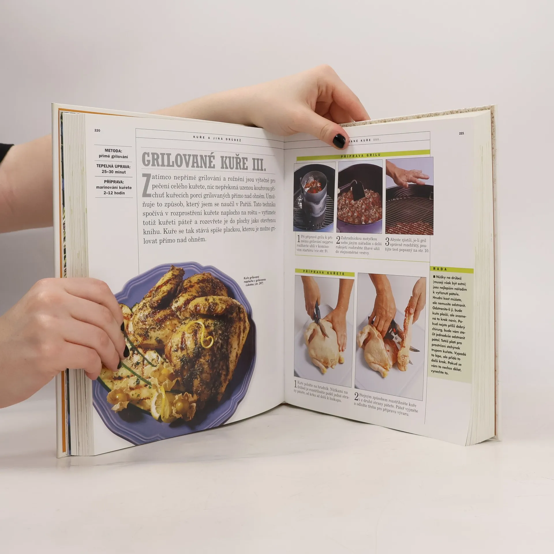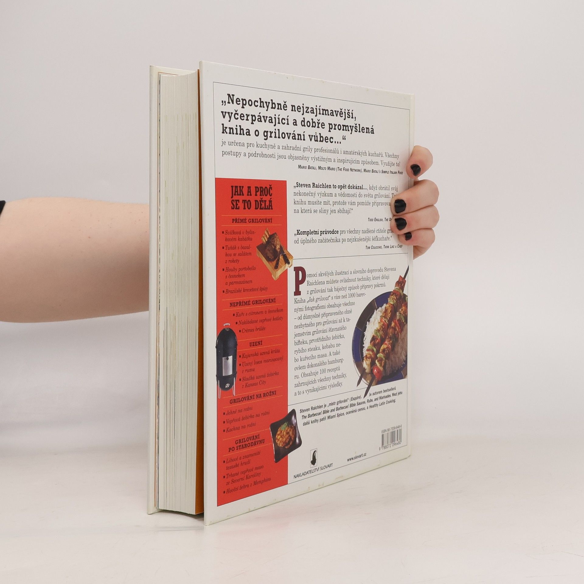 Velká ilustrovaná kniha o technikách barbecue. Kniha pomůže řešit otázky, se kterými jste se jistě setkali při grilování, ale nevěděli jste, na koho se obrátit, aby vám poradil. Povede vás na každém kroku pečením na otevřeném ohni: od výběru a koupi grilu až po bezpečné zapálení ohně a jeho používání na přímé a nepřímé grilování a uzení. Přehled základních jídel a jejich úprav, které by měl každý umět na grilu připravit; perfektní kuřecí prsa; ryby, které se nelepí na mřížku grilu; jemné šťavnaté kotlety i náročnější jídla, která z vás udělají hvězdu pikniku a rožni.