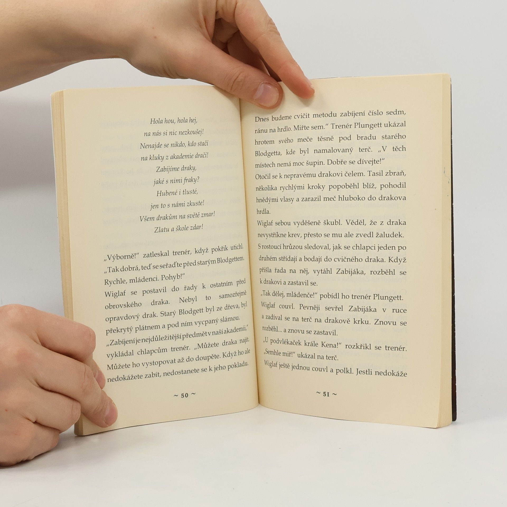 Série knih Drakobijecká akademie pro děti, plná magie, draků a dobrodružství. V v poslední kapitole naleznete česko-anglický zrcadlový text k procvičení svých jazykových dovedností. Svébytný humor je založen zejména na paradoxu, že dětský hrdina Wiglaf se chce stát drakobijcem, ale přitom nesnese pohled na krev. Wiglaf je z rodu důvtipných sympaťáků, s nimiž se mohou identifi kovat kluci i holky mladšího i staršího školního věku. V příběhu situovaném do středověkých anglických reálií hraje významnou roli i prostředí akademie se svéráznými postavami – potrhlými profesory a plejádou nešikovných žáků, mezi nimiž nechybí ani ženský element. Toto prostředí notně zpopularizovala sága o mladém čaroději Harry Potterovi, kterou nelze v souvislosti s Drakobijeckou akademií nevzpomenout. 1. díl Prvně do školy Potulný pěvec Wiglafovi předpoví, že se stane hrdinou, a Wiglaf se tedy vypraví naplnit své poslání: stane se studentem Drakobijecké akademie. Jak se ale vůbec může vyučit drakobijcem, když nesnáší pohled na krev?
