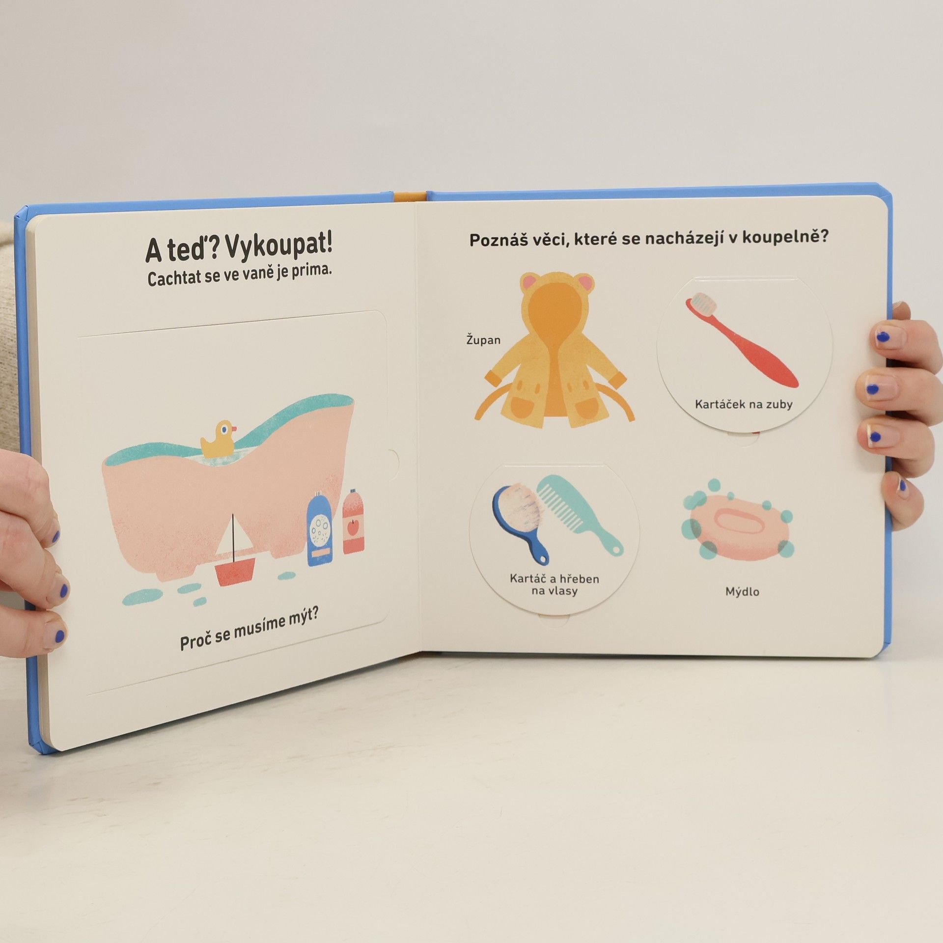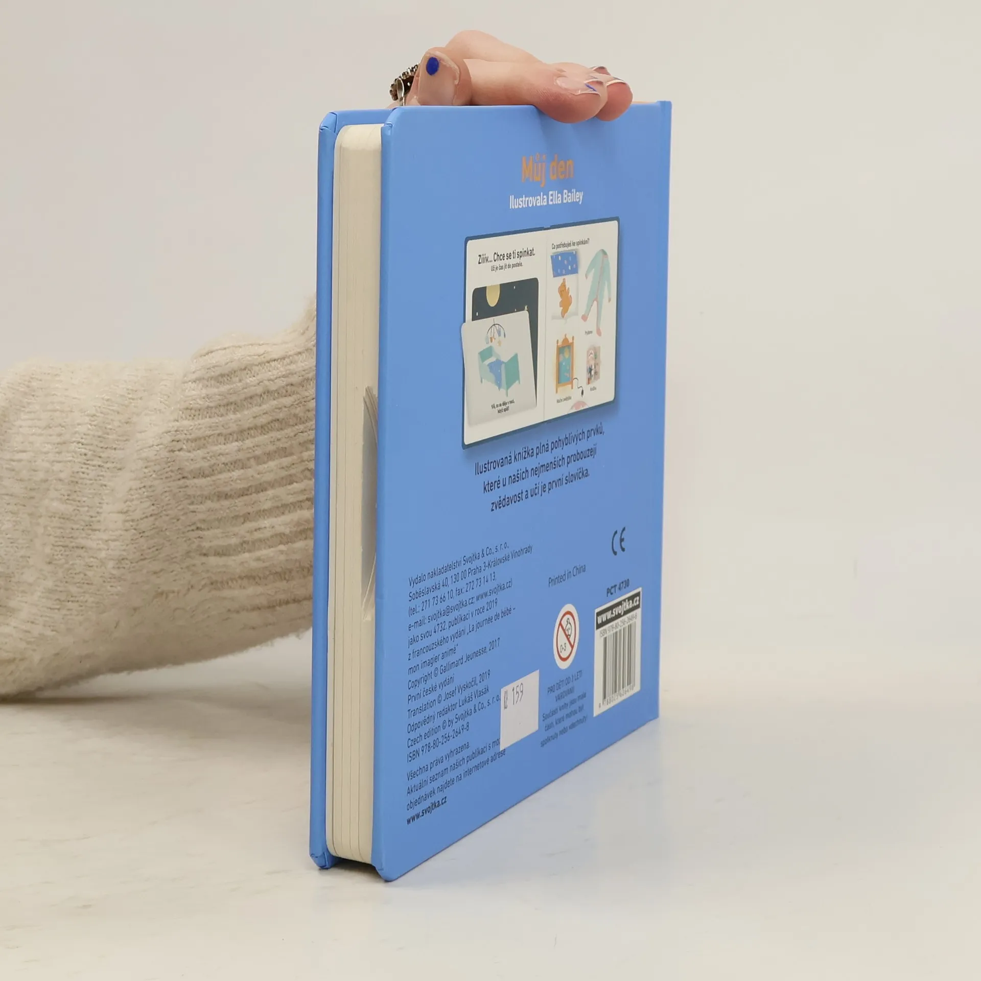 Ilustrovaná knížka o každodenních činnostech plná pohyblivých prvků, které u našich nejmenších probouzejí zvědavost a učí je první slovíčka. Rytmus dne a střídání pravidelných činností je jedna z prvních věcí, které se malé děti učí vnímat a předvídat. V této pěkně a vkusně ilustrované knížce se seznámí s tím, jak probíhá běžný den. Budou poznávat situace, které dobře znají, ať je to procházka spojená s hraním na hřišti, nebo večerní koupání a ulehnutí do postýlky. Pohyblivé prvky pomohou malým čtenářům uvědomit si, jak je svět kolem nich neustále v pohybu. Popisky k obrázkům děti zaujmou a vtáhnou je do čtení. Děti budou poznávat známé předměty a aktivity a osvojí si jejich pojmenování. Pohyblivé prvky rozvíjejí jemnou motoriku dítěte.