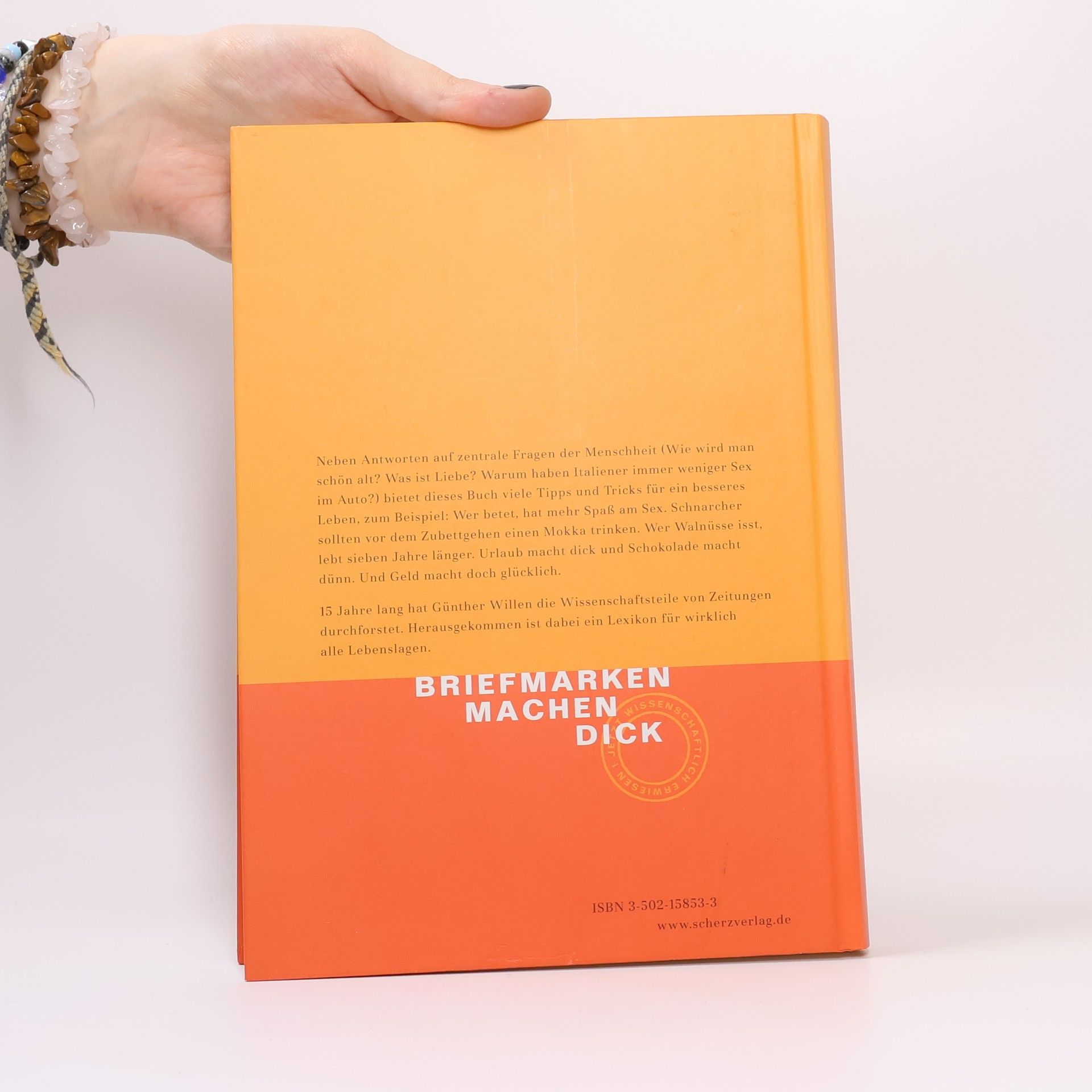 15 Jahre lang hat Günther Willen die Wissenschaftsteile von Zeitungen durchforstet. Herausgekommen ist dabei ein Lexikon für alle Lebenslagen mit fast 2000 Stichwörtern und ca. 6666 Einzelmeldungen. Neben Antworten auf zentrale Fragen der Menschheit (Wie wird man schön alt? Was ist Liebe? Warum haben Italiener immer weniger Sex im Auto?), bietet dieses Buch viele Tipps und Tricks für ein besseres Leben, z. B.: Wer betet, hat mehr Spaß am Sex. Schnarcher sollten vor dem Zubettgehen einen Mokka trinken. Wer Walnüsse isst, lebt sieben Jahre länger. Urlaub macht dick und Schokolade macht dünn. Und Geld macht doch glücklich. Und: Es geht in diesem Buch einzig und allein darum, die Leser in die Lage zu versetzen, das Leben entweder mehr zu geniessen oder es besser zu ertragen (Dr. Samuel Johnson).
