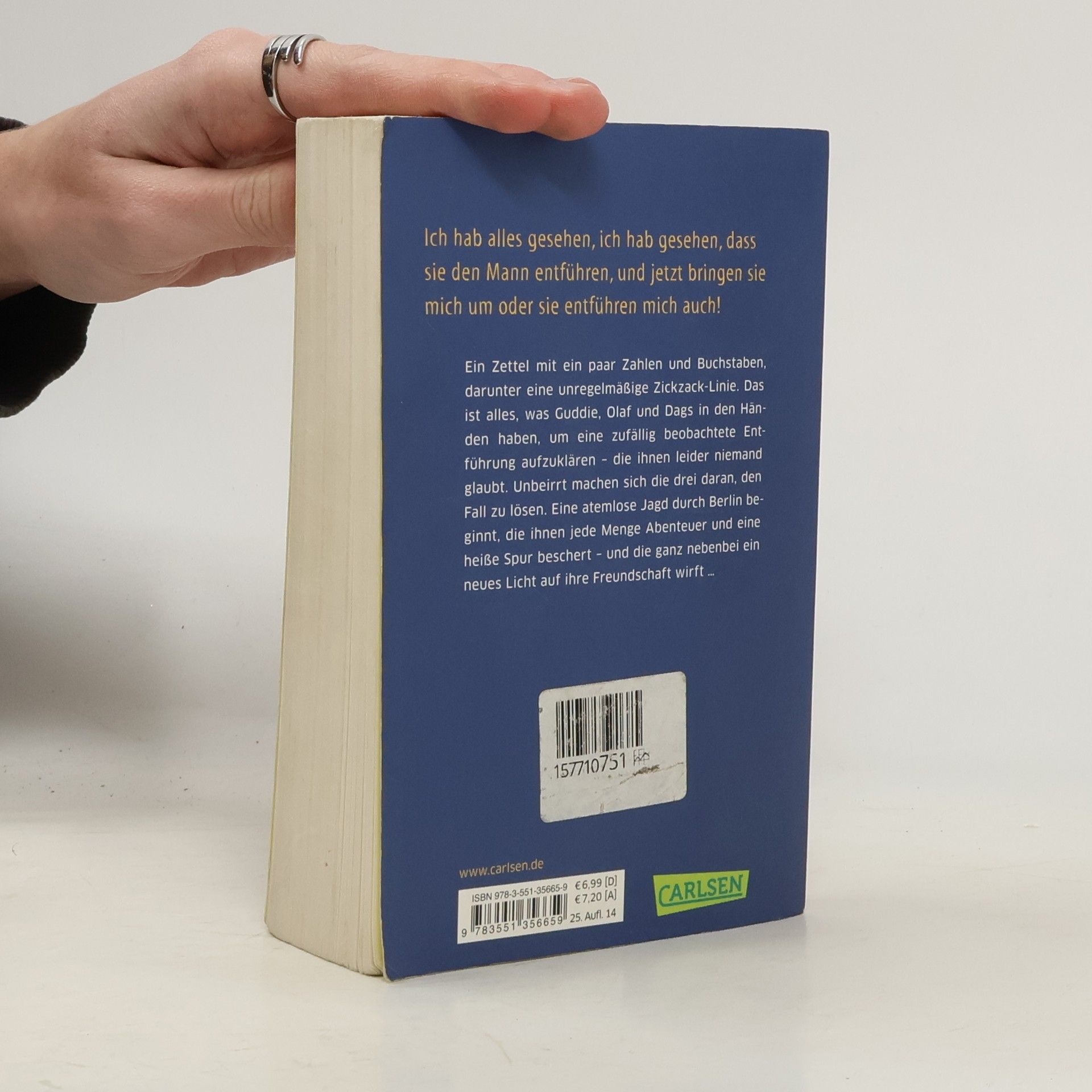 Ein Zettel mit ein paar Zahlen und Buchstaben, darunter eine unregelmäßige Zickzack-Linie. Das ist alles, was Guddie, Olaf und Dags in den Händen haben, um eine zufällig beobachtete Entführung aufzuklären – die ihnen leider niemand glaubt. Unbeirrt machen sich die drei daran, den Fall zu lösen. Eine atemlose Jagd durch Berlin beginnt, die ihnen jede Menge Abenteuer und eine heiße Spur beschert – und die ganz nebenbei ein neues Licht auf ihre Freundschaft wirft …