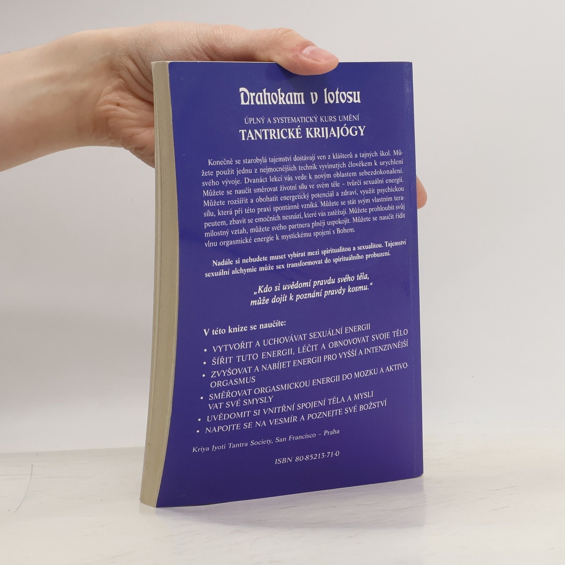 Úplný a systematický kurs umění tantrické krijajógy. Sexuální cesta k vyššímu vědomí. Naučíte se vytvářet a uchovávat sexuální energii, šířit tuto energii, léčit a obnovovat svoje tělo, zvyšovat a nabíjet energii pro vyšší a intenzivnější orgasmus, směřovat orgasmickou energii do mozku a aktivovat své smysly, uvědomit si vnitřní spojení těla a mysli, napojit se na vesmír a poznat své božství.