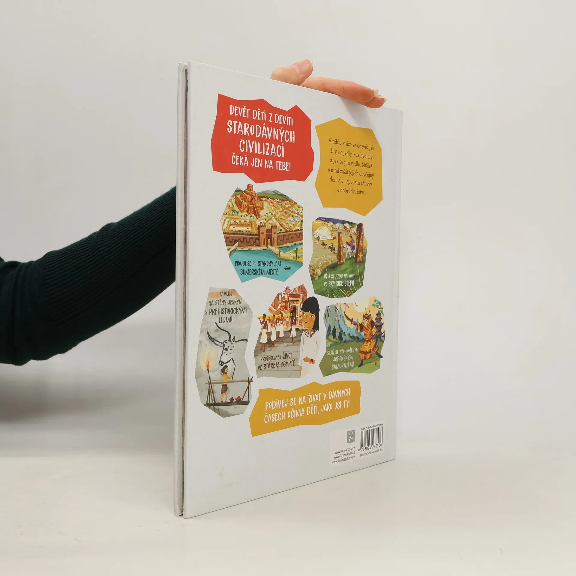 Představte si, že byste se narodili v době kamenné. Nebo ve starověkém Římě či Egyptě, jako Skytové na asijských stepích, jako Vikingové na dalekém severu… Jak by se vám asi žilo? Někdy by to možná bylo nebezpečné, ale taky vzrušující a rozhodně zábavné! Podívejte se spolu s námi za dětmi z devíti dávných kultur celého světa (paleolit, neolit, Sumerové, Japonsko, Alexandrie, Egypt, Olmékové, Skytové, Vikingové) a dozvíte se, jak bydlely, co jedly, čím se bavily, zkrátka jak vypadal jejich život.