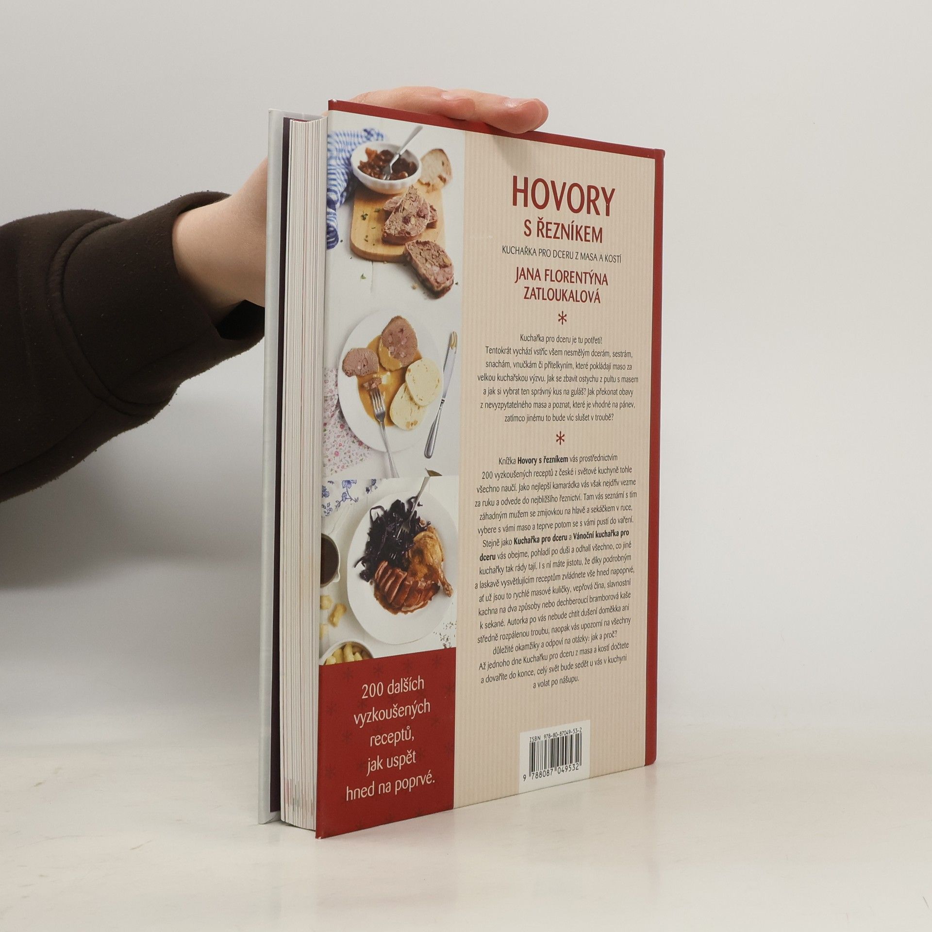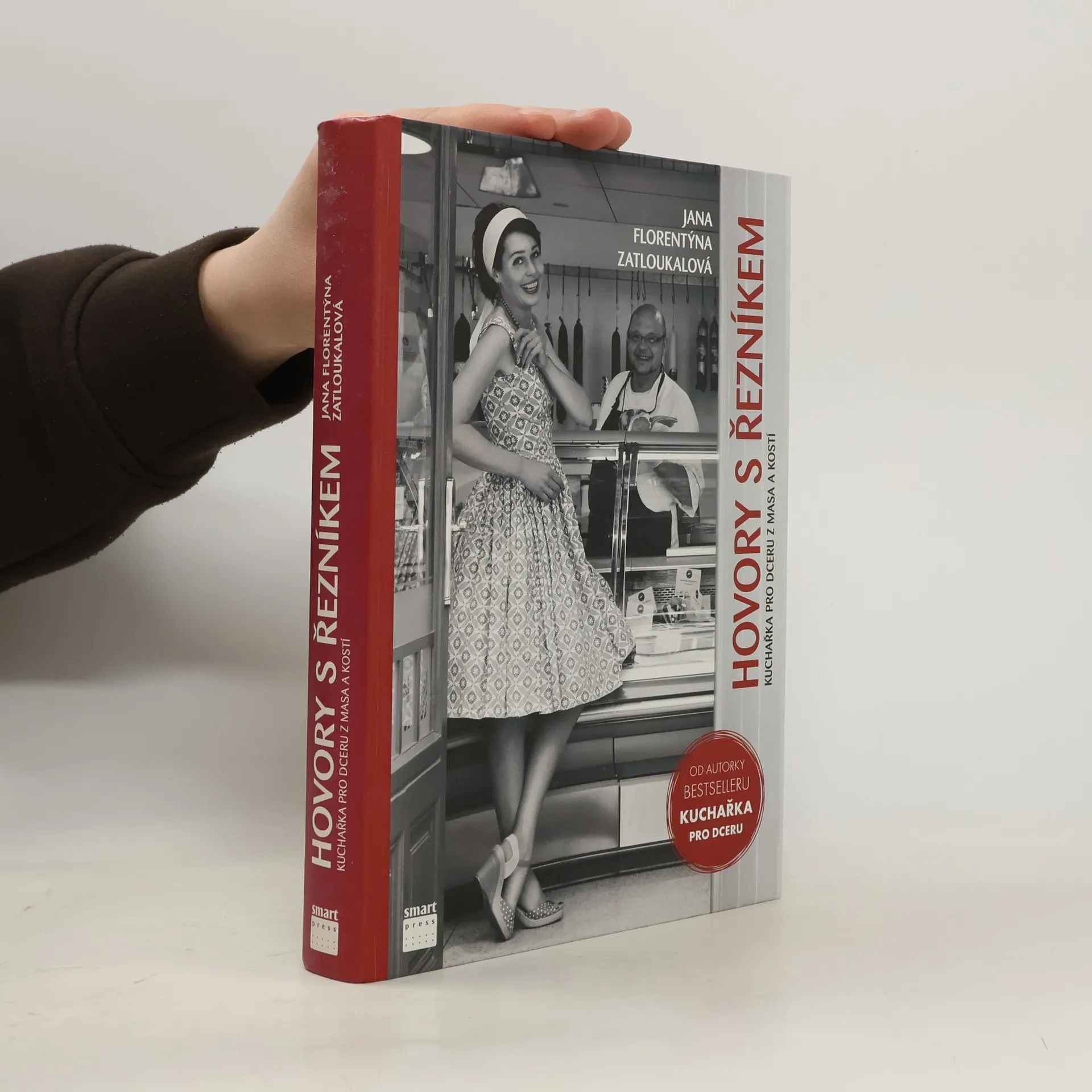 Kuchařka pro dceru je tu potřetí! Tentokrát vychází vstříc všem nesmělým dcerám, sestrám, snachám, vnučkám či přítelkyním, které pokládají maso za velkou kuchařskou výzvu. Jak se zbavit ostychu z pultu s masem a jak si vybrat ten správný kus na guláš? Jak překonat obavy z nevyzpytatelného masa a poznat, které je vhodné na pánev, zatímco jinému to bude víc slušet v troubě? Knížka Hovory s řezníkem vás prostřednictvím 200 vyzkoušených receptů z české i světové kuchyně tohle všechno naučí. Jako nejlepší kamarádka vás však nejdřív vezme za ruku a odvede do nejbližšího řeznictví. Tam vás seznámí s tím záhadným mužem se zmijovkou na hlavě a sekáčkem v ruce, vybere s vámi maso a teprve potom se s vámi pustí do vaření. Stejně jako Kuchařka pro dceru a Vánoční kuchařka pro dceru vás obejme, pohladí po duši a odhalí všechno, co jiné kuchařky tak rády tají. I s ní máte jistotu, že díky podrobným, laskavým a vysvětlujícím receptům zvládnete vše hned napoprvé, ať už jsou to rychlé masové kuličky, vepřová čína, slavnostní kachna na dva způsoby nebo dech beroucí bramborová kaše k sekané. Autorka po vás nebude chtít dušení doměkka ani středně rozpálenou troubu, naopak vás upozorní na všechny důležité okamžiky a odpoví na otázky: jak a proč? A až jednoho dne Kuchařku pro dceru z masa a kostí dočtete a dovaříte až do konce, celý svět bude sedět u vás v kuchyni a volat po nášupu. První dotisk 2013.